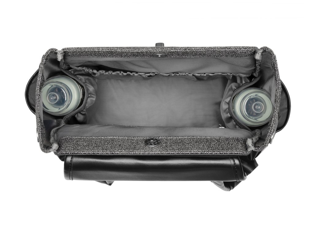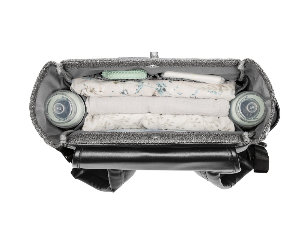 Přebalovací batoh z luxusního strukturovaného materiálu s detaily z umělé kůže umožňuje přehledné uložení všeho potřebného na procházky a výlety s vaším dítětem. Klipy umožňují zavěšení na madla kočárku. Magnetické uzavírání s otočným kovovým uzávěrem umožňují snadné otevření batohu jednou rukou. Uvnitř batohu najdete množství kapes a přihrádek i voděodolnou kapsu pro uložení vlhkých předmětů. Široký způsob otevírání batohu usnadňuje orientaci v uloženém obsahu. Na vnější straně najdete kapsy s uzavíráním na zip i kapsu pro uložení láhve. Termoizolační kapsy na láhve pomáhají udržet nápoje či mléko delší dobu v optimální teplotě. Součástí batohu je i přebalovací podložka. Batoh je možné zavěsit na kočárek, připevnit k rukojeti kufru, nosit na zádech i v ruce. Složení: 100% polyester Rozměry: 40 x 28 x 15 cmDoplňkové parametry