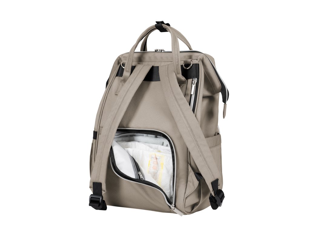 Stylový přebalovací batoh umožňuje přehledné uložení všeho potřebného na procházky a výlety s vaším dítětem. Klipy umožňují zavěšení na madla kočárku. Uvnitř batohu najdete množství kapes a přihrádek i voděodolnou kapsu pro uložení vlhkých předmětů. Široký způsob otevírání batohu usnadňuje orientaci v uloženém obsahu. Na vnější straně najdete kapsy s uzavíráním na zip i kapsu pro uložení láhve. Termoizolační kapsy na láhve pomáhají udržet nápoje či mléko delší dobu v optimální teplotě. Součástí batohu je i přebalovací podložka. Batoh je možné zavěsit na kočárek, nosit na zádech i v ruce. Složení: 100% polyester Rozměry: 44,5 x 35,5 x 47 cmDoplňkové parametry