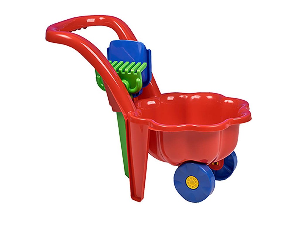 Dětské zahradní kolečko s lopatkou a hráběmi BAYO Sedmikráska červené