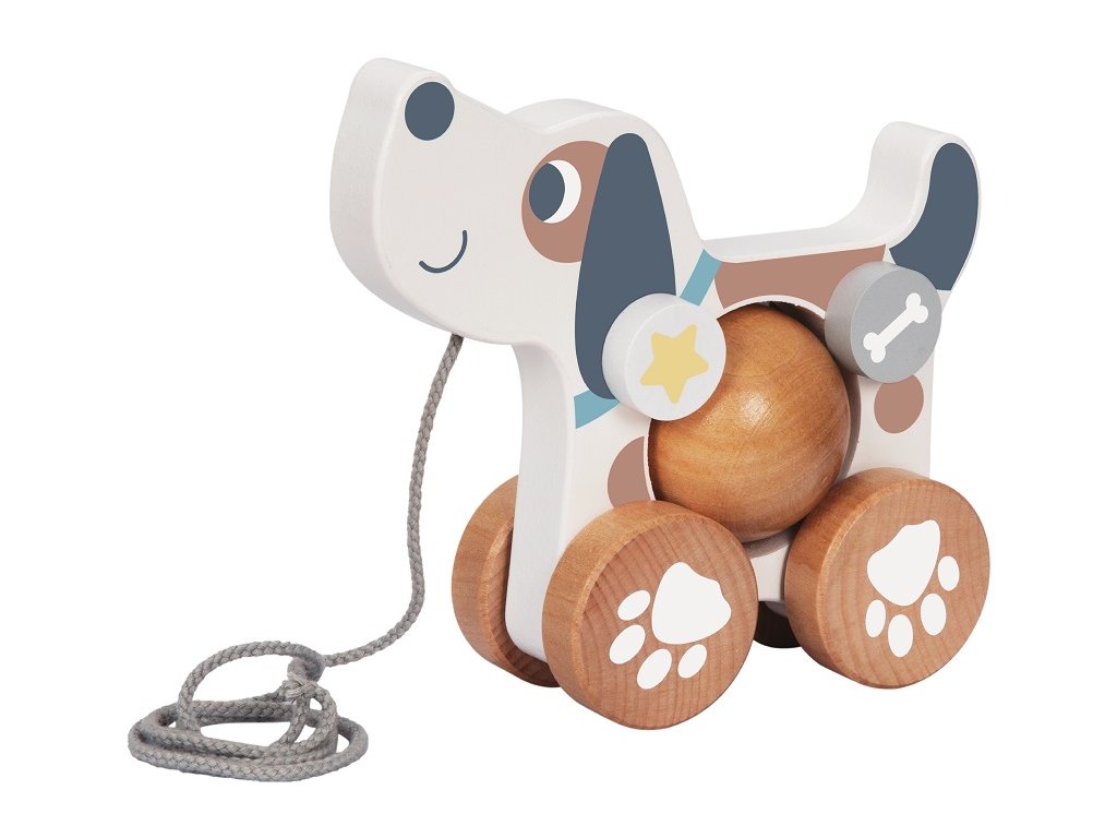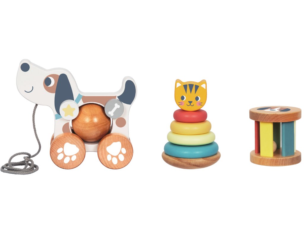 S touto sadou zábavných motorických hraček se Vaše dítě rozhodně nudit nebude! Pejsek na provázku se stane nerozlučným kamarádem každého dítěte při jeho prvních samostatných krůčcích a procházkách. Válec při otáčení díky kuličce uvnitř vydává chrastivý zvuk a stimuluje tak sluch. A díky nasazovacím kroužkům na tyč s motivem kočičky si děti procvičí jemnou motoriku, koordinaci ruka oko a učí se rozpoznávat barvy. Hračky jsou vyrobeny ze dřeva s certifikací FSC® a opatřeny netoxickými barvami v jemných odstínech v kombinaci s barvou přírodního dřeva. Hlavní vlastnosti: sada 3 hračekrozvíjí jemnou motoriku a koordinaci ruka-okoučí rozpoznávat barvyvyrobeno ze dřeva s certifikací FSC® vhodné jako dárekod 1 roku věku Značka a certifikát FSC® (Forest Stewardship Council) zaručuje, že dřevo, ze kterého byl produkt vyroben, nebylo vytěženo nelegálně a pochází z lesů obhospodařovaných šetrným či přírodě blízkým způsobem, ve kterém jsou dodržovány přísné environmentální a sociální požadavky. Značka FSC® na výrobku znamená, že svým nákupem pomáháte chránit lesy a podporujete šetrné, odpovědné či přírodě blízké hospodaření, díky kterému jsou naše lesy stabilnější, zdravější, mají přirozenou druhovou skladbu a lépe odolávají negativním následkům klimatických změn.Sizing info