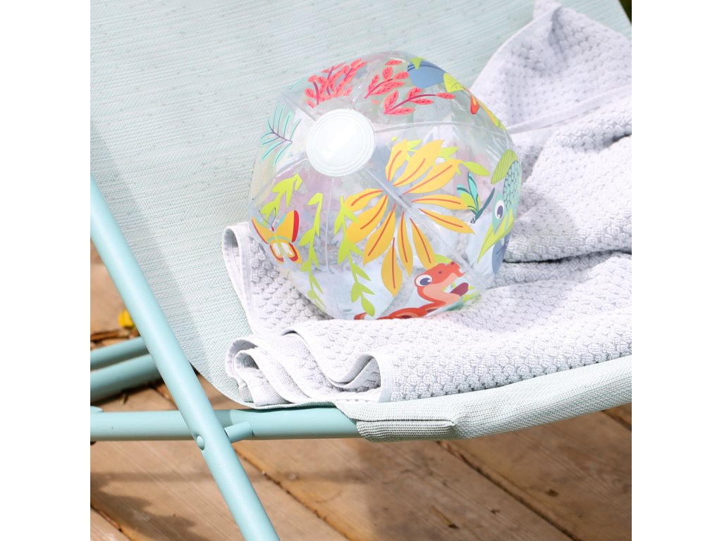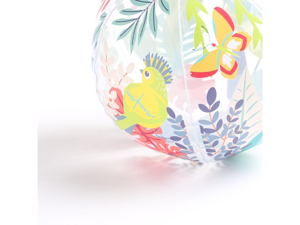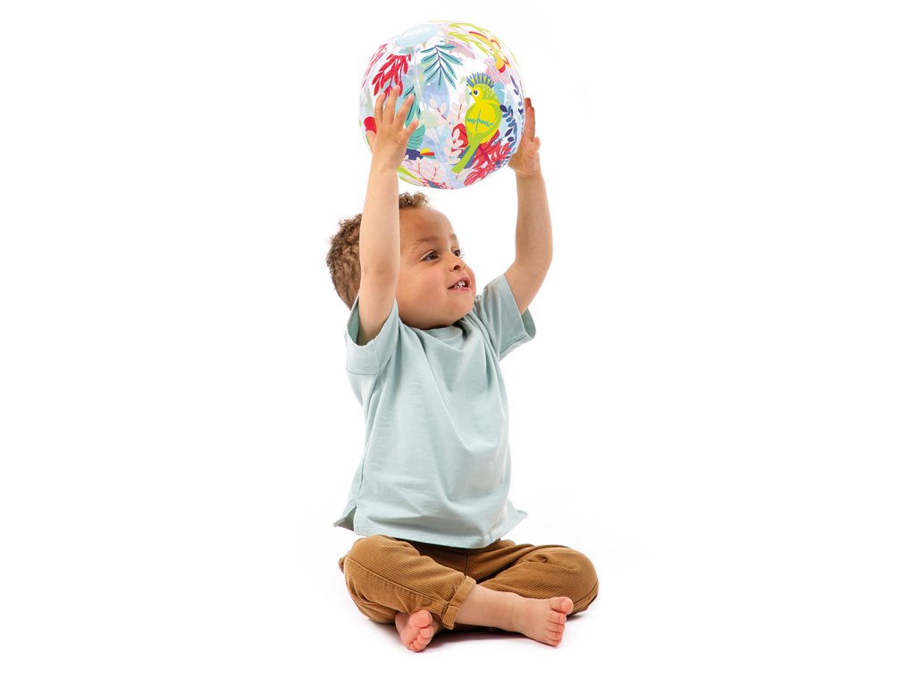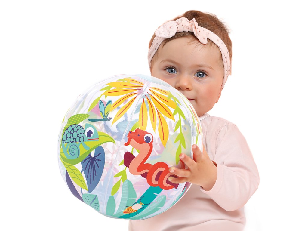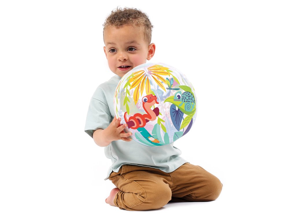 Nafukovací míč Jungle Ball je navržený speciálně pro nejmenší – pomáhá dětem objevovat svět pohybu, hmatu i zraku. Díky tropickému motivu a veselým barvám přitahuje pozornost a probouzí přirozenou zvídavost dítěte. Děti si s míčem mohou házet, kutálet ho, odrážet i sledovat jeho pohyb. Hraní s míčem stimuluje hrubou motoriku, reflexy i představivost. Míč má ideální průměr 20 cm – snadno ho uchopí i malé dětské ručky Měkce nafouknutý a příjemný na dotek – bezpečný při hře doma i venku Průhledné detaily přidávají vizuální zajímavost a podporují rozvoj zraku a koordinace Rozměry: Ø 20 cm Složení: 100 % PVC Vhodné pro děti od 6 měsíců.Doplňkové parametry
