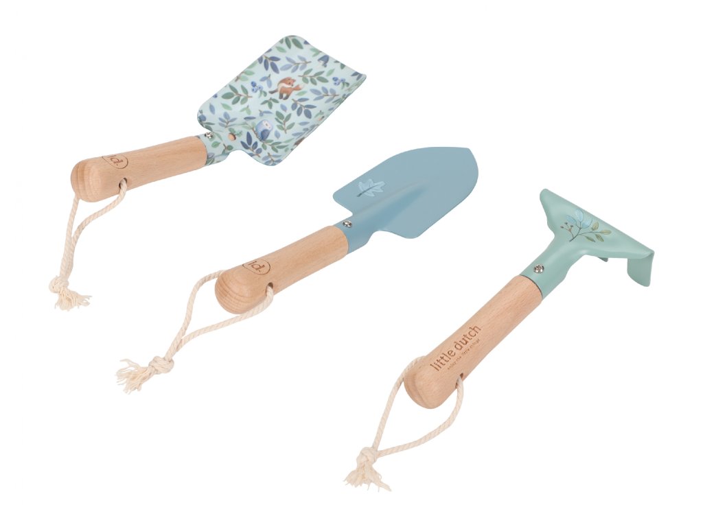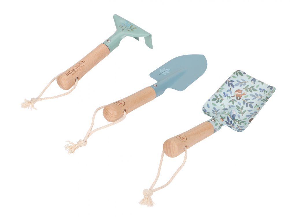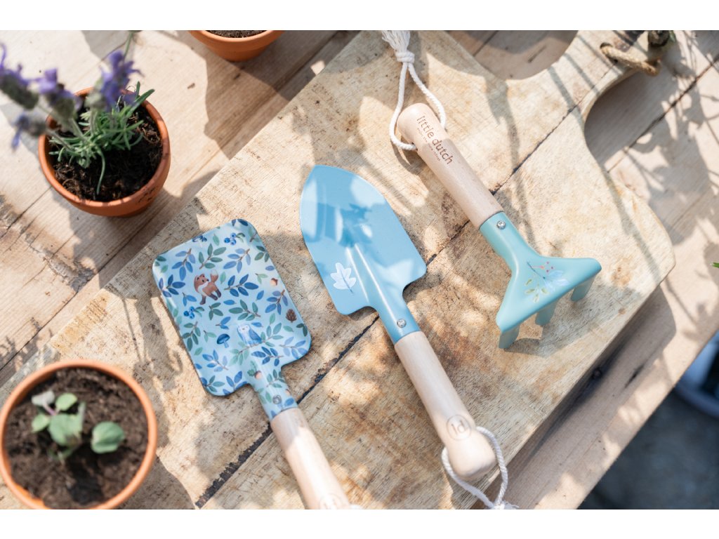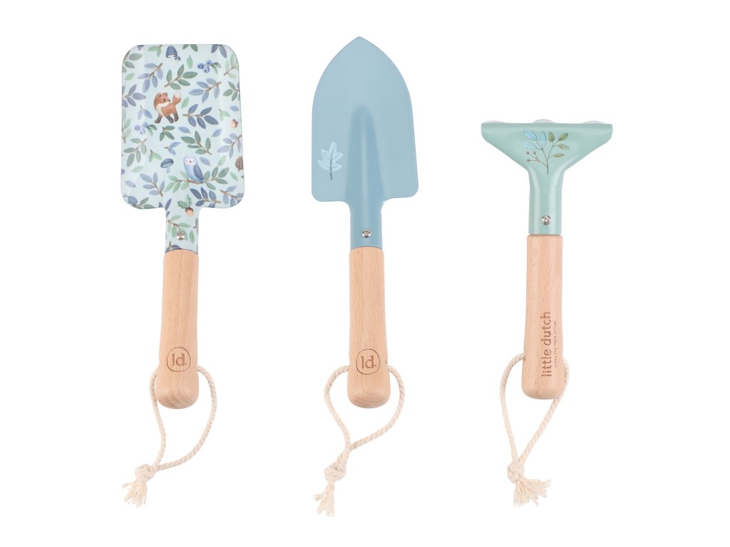 Malá zahradnice či zahradník potřebuje pro své zahradničení své vlastní nářadí! Tato sada obsahuje dvě lopatky a hrabičky v kvalitním provedení z odolného kovu s dřevěnou rukojetí pro pohodlné uchopení. Nářadí je zdobené krásným potiskem, praktická poutka umožňují po skončení práce zavěšení nářadí kdekoli, kde bude připravené pro další použití. Nářadí s krásným potiskem je součástí designové kolekce hraček a doplňků Little Dutch Forest Friends, inspirované životem v lese. Vhodné pro děti od 3 let.Doplňkové parametry