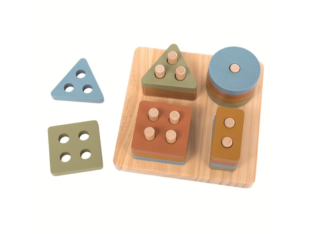 Nasazovací hra je skvělou pomůckou pro rozvoj jemné motoriky a logického myšlení dětí. Na dřevěné destičce jsou umístěny tyče, na které děti nasazují různé geometrické tvary – čtverec, trojúhelník, kruh a obdélník. Tyčky jsou v podložce pružně uchycené pomocí gumičky, takže se dají sklápět a hra je pro děti zcela bezpečná. Každý tvar má jiný počet dírek, což dětem pomáhá pochopit princip třídění podle tvaru i počtu otvorů. Při hře si děti procvičují koordinaci ruka-oko, zlepšují úchop a přesnost pohybu, což přispívá k celkovému rozvoji motorických dovedností. Nasazování tvarů na správná místa podporuje koncentraci, trpělivost i schopnost řešit jednoduché úkoly. Děti se také učí rozpoznávat a pojmenovat barvy, což podporuje zrakové vnímání a jazykový rozvoj. Tato didaktická hračka je vhodná pro malé děti od 1 roku a nabízí zábavnou formu učení prostřednictvím hry. Hlavní vlastnosti: 17 dílůsklápěcí tyčky pružně uchycené k podložce pomocí gumičkyrozvíjí motorické dovednosti a koordinaci ruka-okopodporuje koncentraci a trpělivostučí rozpoznávání tvarů a barevvhodné od 1 rokuSizing info