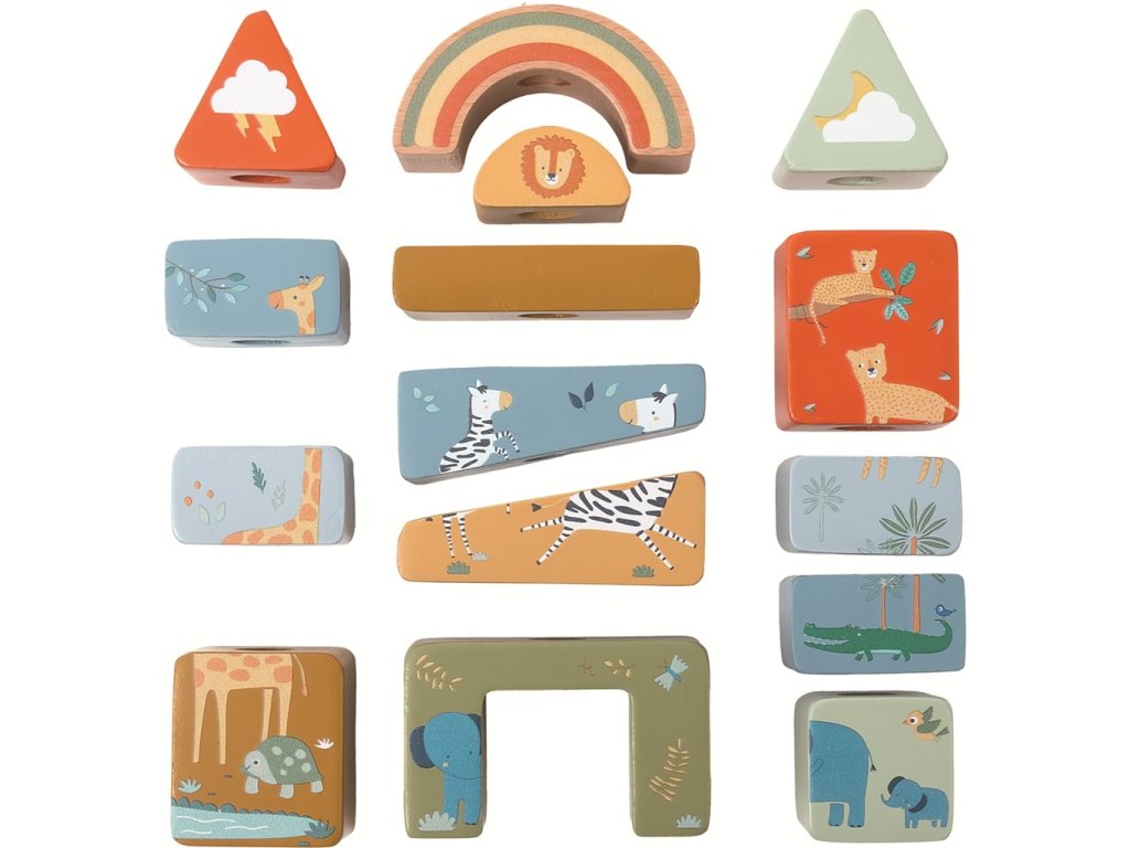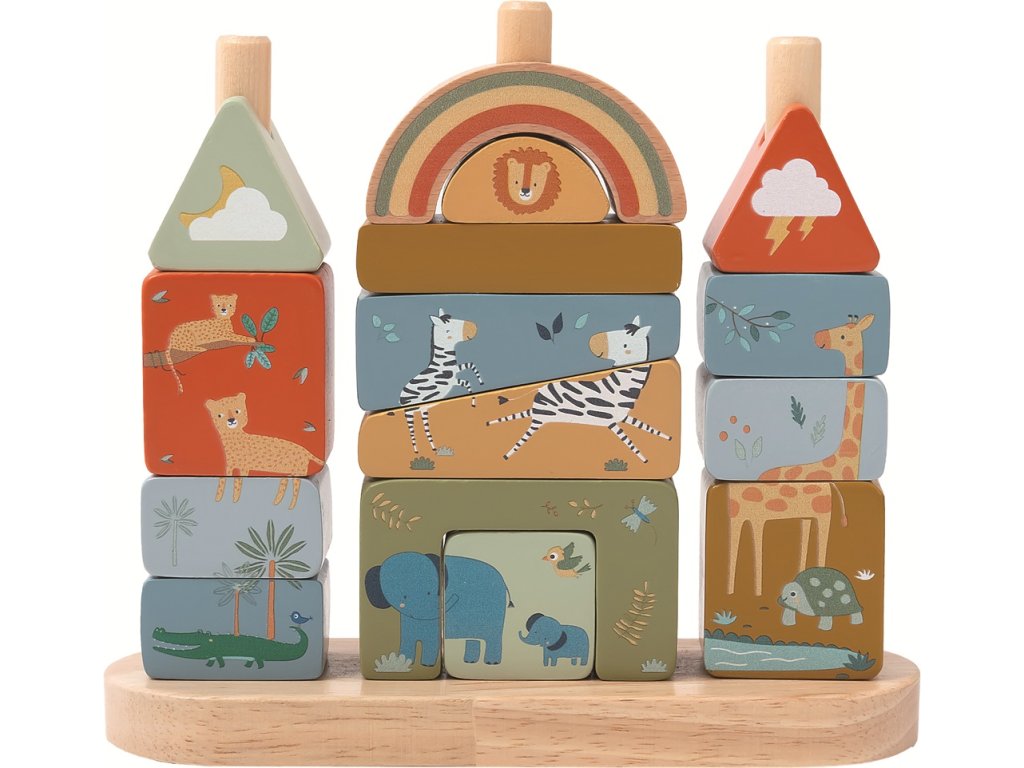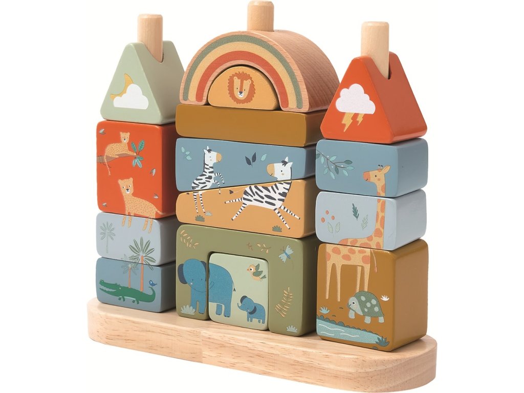 Vydejte se na dobrodružnou cestu na safari, bez zavazadel, bez pasu, zato s pořádnou dávkou fantazie! Tato originální nasazovačka přináší zábavu i rozvoj v jednom. Děti na tyče nasazují kostky s obrázky zvířátek. Potěší je žirafa s mládětem, krokodýl, zebra s malým zebřátkem i slon. Každý dílek má své místo, a jakmile je vše správně nasazeno, před dětmi se objeví celá safari rodinka. Skládání rozvíjí logické myšlení, jemnou motoriku a koordinaci ruka-oko. Děti se také naučí rozeznávat a pojmenovat zvířátka. Díky kombinaci dřevěného materiálu a přírodních zemitých odstínů se stane pěkným doplňkem dětského pokojíčku nebo herny. Hlavní vlastnosti: tři dřevěné tyčky pro nasazování kostekmotiv Safari rozvíjí logické myšlenírozvíjí jemnou motoriku, koordinaci ruka-oko a představivostkombinace přírodního dřeva a zemitých odstínůstabilní a bezpečné zpracování atraktivní doplněk dětského pokojíčku nebo hernyvhodné pro děti od 1 rokuSizing info