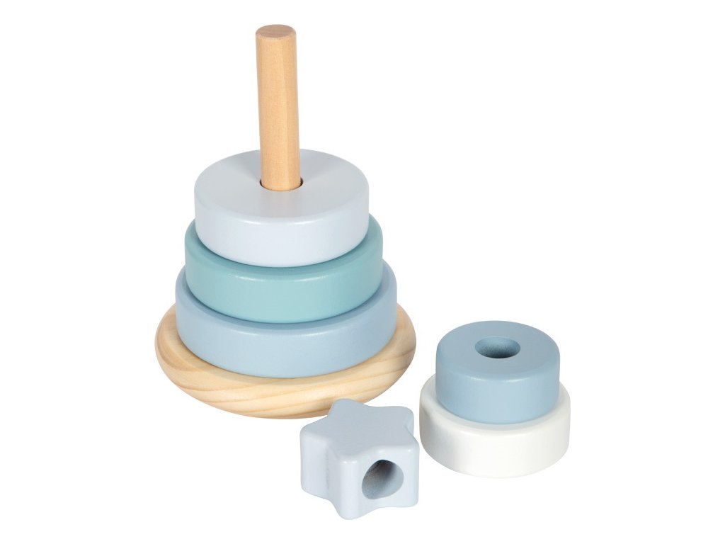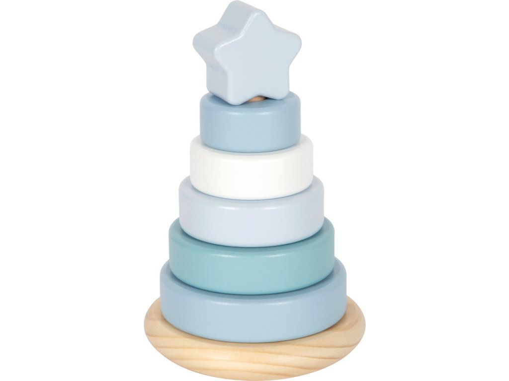 Tato dřevěná stohovací věž v jemných pastelových odstínech modré s přírodními prvky je zakončena hvězdou, které hračce dodává osobité kouzlo. Různě barevné a velikostně odstupňované kroužky pomáhají dětem procvičovat jemnou motoriku, soustředění i vnímání velikostí. Věž má zaoblenou základnu, díky které se může lehce pohupuje – to z ní dělá nejen edukativní, ale i zábavnou hračku. Bezpečná, pohyblivá centrální tyč se při zatlačení ohýbá, což zajišťuje větší bezpečnost při hře i snadnější navlékání kroužků. Hlavní vlastnosti: 7dílná nasazovací věž s hvězdoujemné pastelové odstíny v kombinaci s přírodním dřevempohyblivá centrální tyčrozvíjí motoriku, koncentraci a vnímání velikostíbezpečné zaoblené hrany a odolný materiálvhodná jako hračka i jako dekoraceSizing info