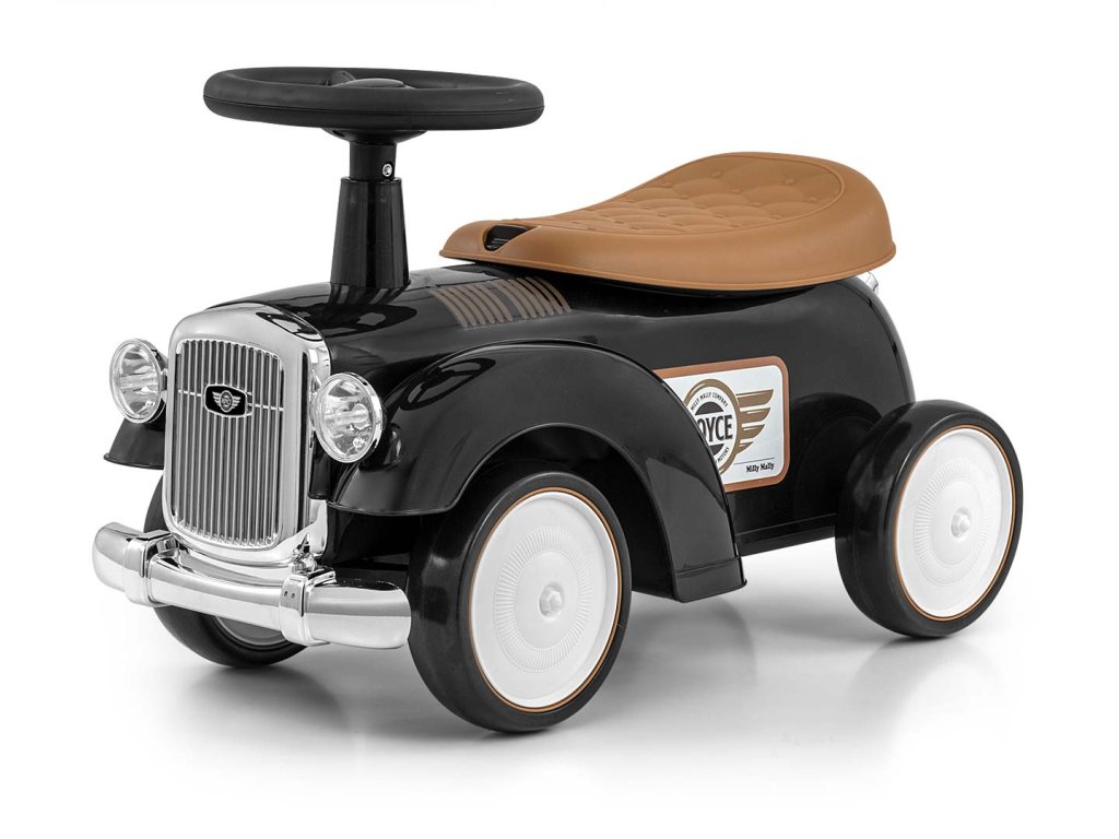Vintage vozidlo Royce by Milly Mally zve malého cestovatele na retro jízdu. Zaujme oku lahodícími barvami. Vozidlo Royce je bohatě vybaveno. Toto malé auto má volant se zvukem a tvarované sedadlo v krásné světle hnědé barvě. Poskytuje vašemu dítěti velkou radost z jízdy, rozvíjí jeho smysl pro rovnováhu a obecné motorické dovednosti. Autíčko má lehkou plastovou konstrukci a ergonomické tvary, což zajišťuje bezpečnou hru pro dítě. Otočný volant našeho pojezdu Royce vám umožní provádět náročné manévry doma i na procházce. Kola tohoto krásného vozidla jsou vyrobena z měkké EVA pěny. Hra prostřednictvím fyzické aktivity je skvělý způsob, jak podpořit správný vývoj našich dětí. Retro autíčko může dítě používat jako první vozidlo se skutečným volantem a klaksonem nebo jako odstrkovadlo s otevírací přihrádkou na hračky (malý kufr), imitací palivové nádrže v zadní části vozidla a přední část vozu - mřížka - ve stříbrné barvě. Logo ROYCE dodává tomuto vozidlu estetiku a prestiž. Vrcholem pojezdu Royce by Milly Mally je jeho dárkové balení ve stylu retro vozidel z počátků automobilového průmyslu. Vozidlo Royce je věnováno všem dětem, které dokážou samostatně sedět. Vozidlo lze používat uvnitř i venku a zpříjemní vašemu dítěti chvíle na procházce.Použití výrobku pod dohledem dospělé osoby.