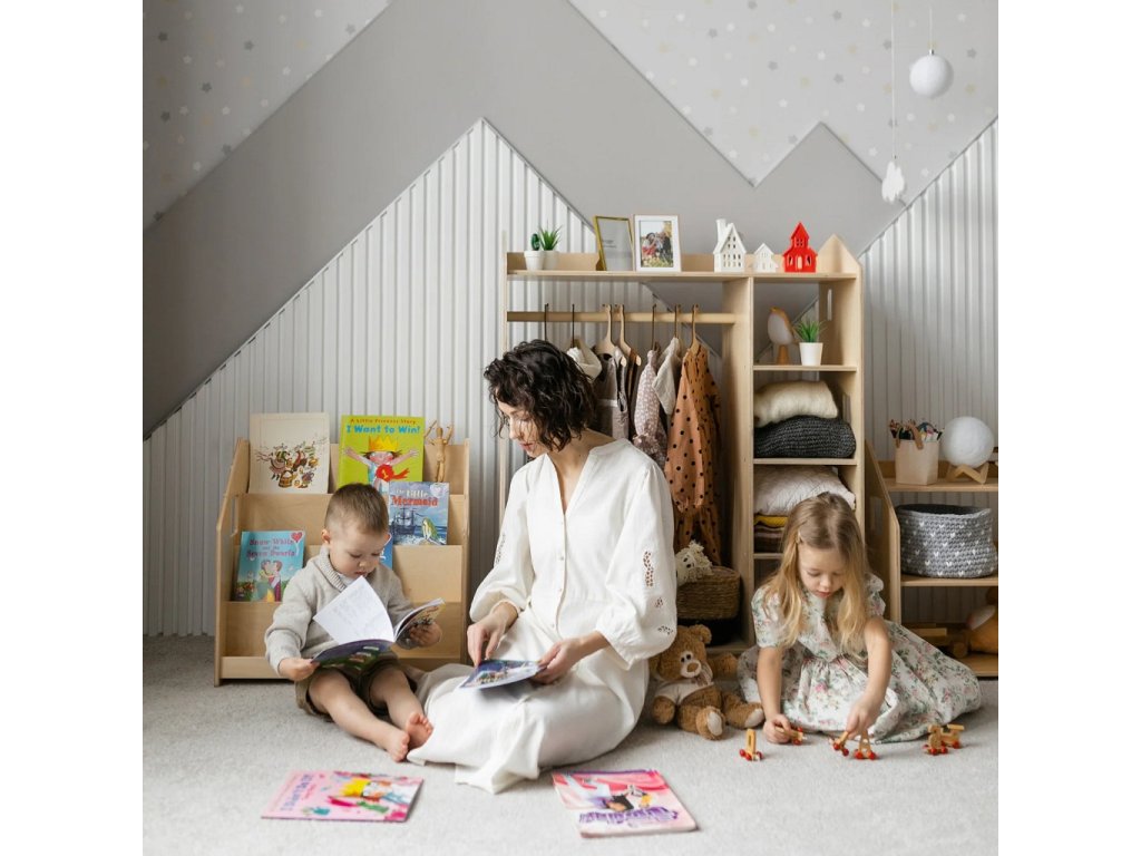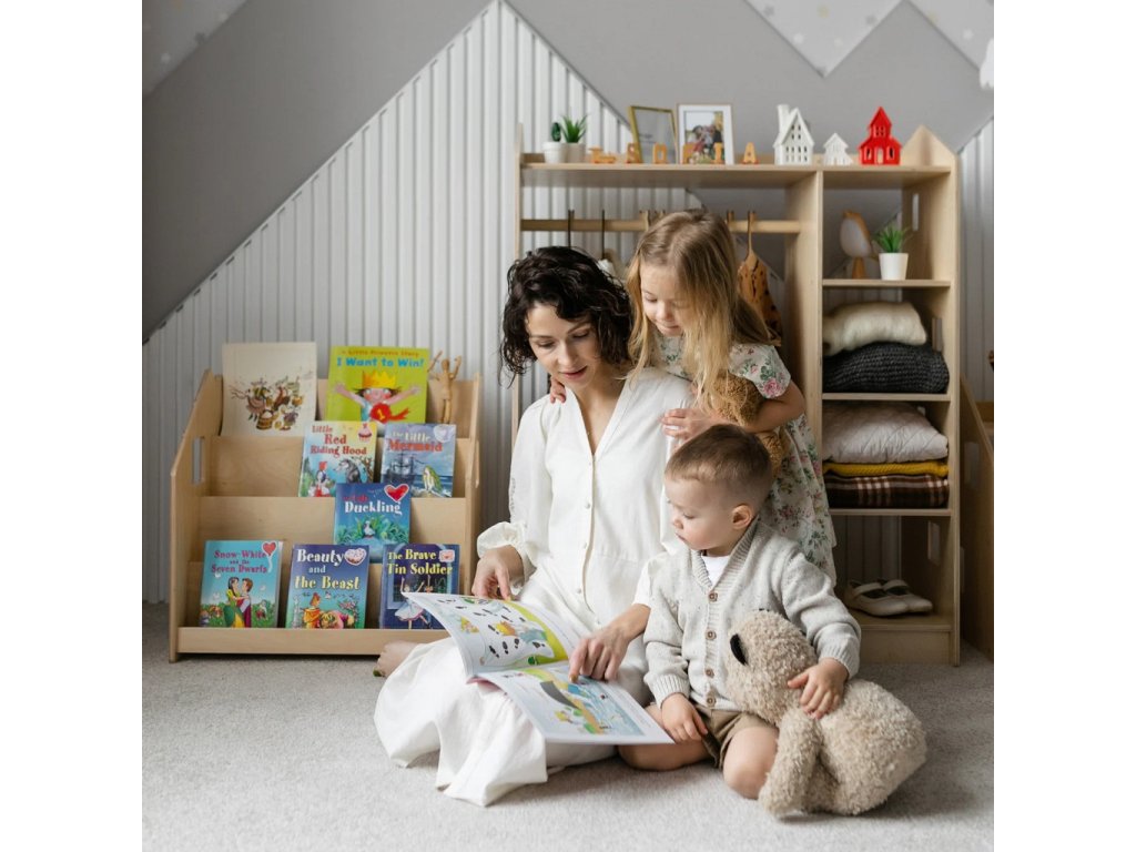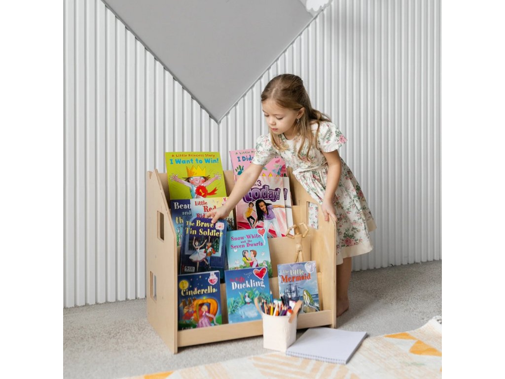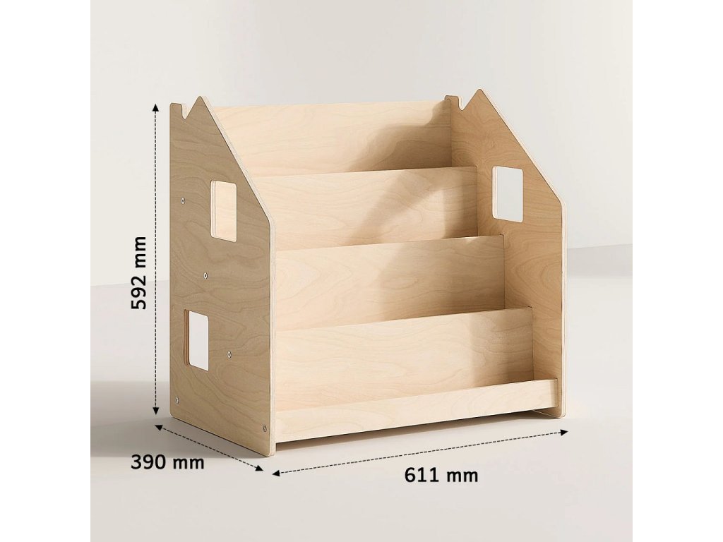 Tento stojan na knihy je navržen tak, aby podporoval dětskou samostatnost a rozvíjel jejich zájem o čtení. Díky tomu, že jsou knížky vidět obálkami dopředu, děti si snadno vyberou tu, která je zaujme a po přečtení ji zase jednoduše vrátí na místo. Police nabízí čtyři prostorné regály a zadní úložný prostor vhodný pro knihy či hračky. Robustní a bezpečná konstrukce s pečlivě zaoblenými hranami je ošetřena lakem na vodní bázi. Díky jednoduchému, čistému designu krásně zapadne do každého interiéru.Stojan je vyroben z kvalitní březové překližky a barevné odchylky, uzly či drobné opravy ve dřevě jsou přirozené a dodávají výrobku jedinečný charakter.Barva produktu se může mírně lišit od fotografie v závislosti na nastavení vašeho zařízení. Hlavní vlastnosti: bezpečný a odolný4 regály a zadní úložný prostorvyrobeno z kvalitní březové překližky, bezpečné laky na vodní bázivyrobeno v České republiceSizing info