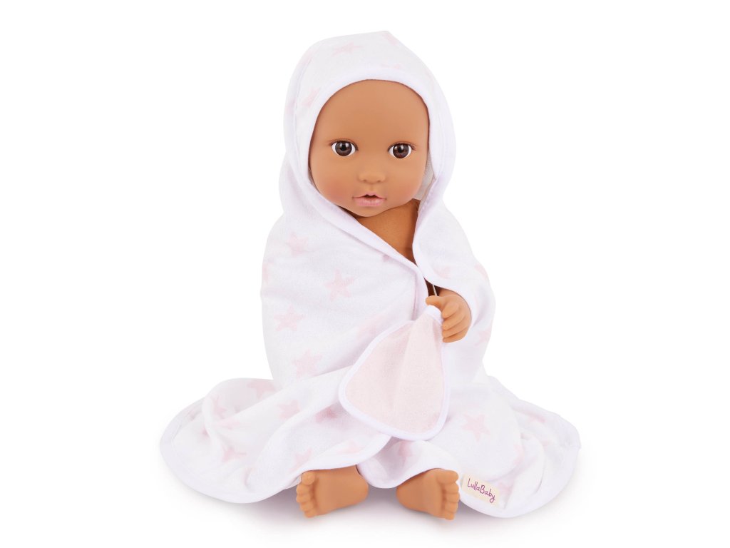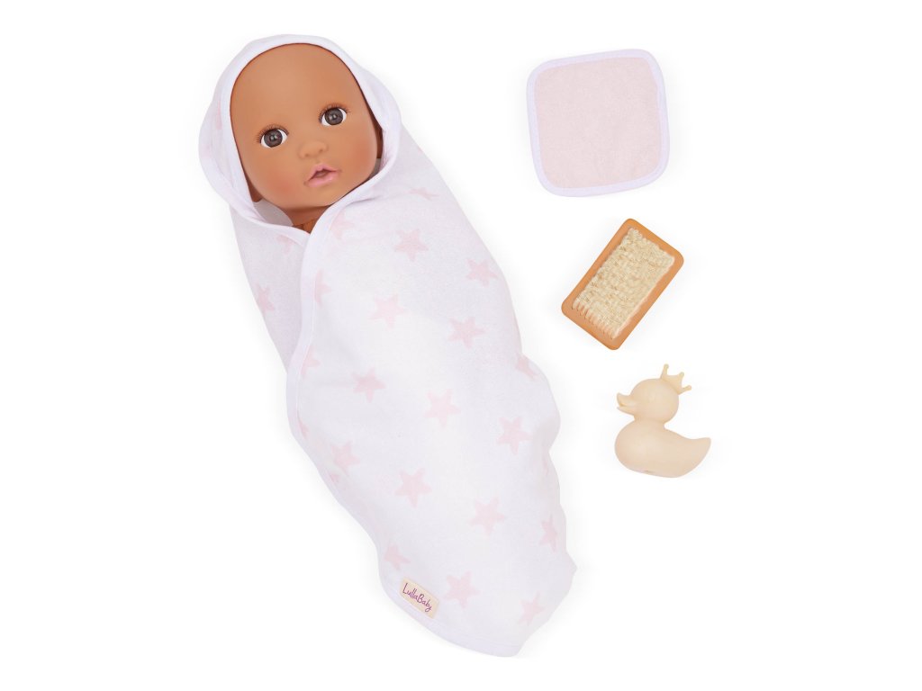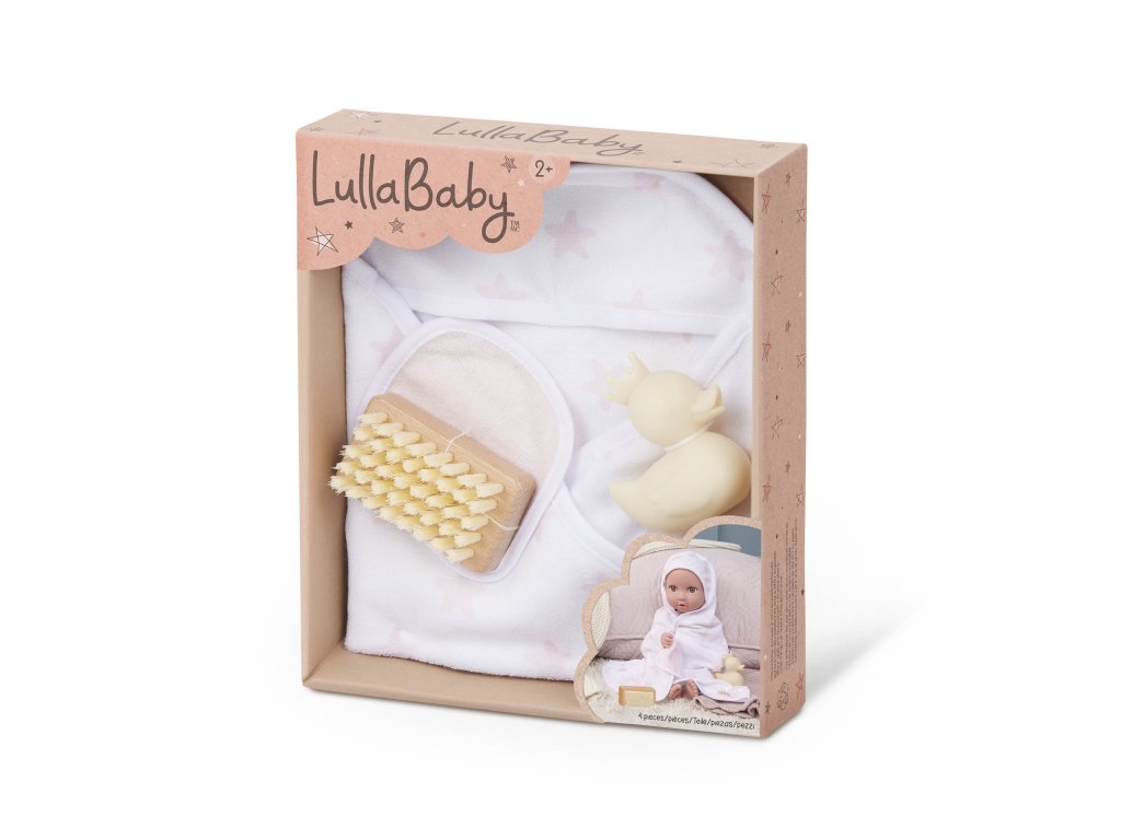 Sada osušky s doplňky LullaBaby obsahuje vše potřebné pro hraní na koupání – děti mohou panenku „umýt“ jemnou žínkou, kartáčem a samozřejmě si užít spoustu zábavy s malou gumovou kačenkou. Po koupeli je čas panenku osušit do měkké osušky s kapucí, která je zdobená růžovým potiskem s hvězdičkami. Celý set je ideální pro rozvíjení empatie, péče a fantazie při hře s panenkami. Vhodné pro většinu panenek velikosti 35 cm. Panenka není součástí balení. Vhodné pro děti od 2 let.Doplňkové parametry