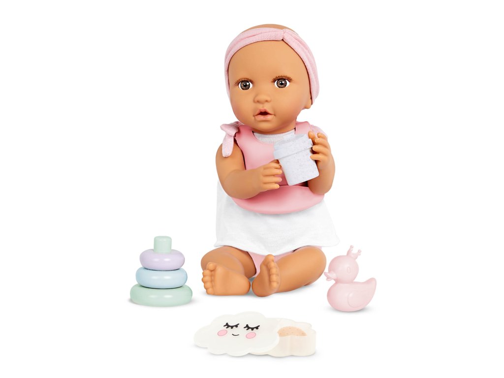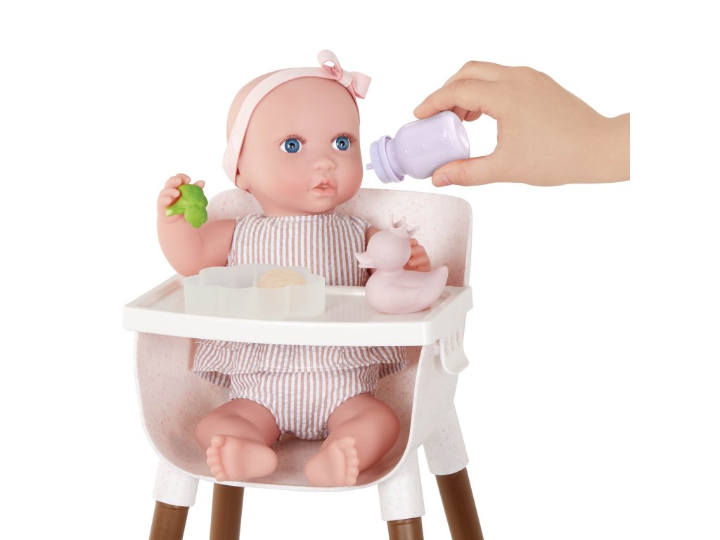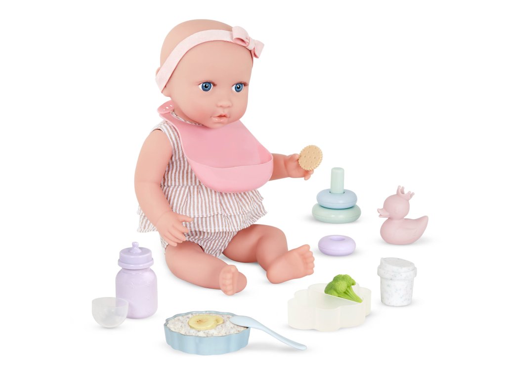 S touto sadou doplňků pro panenku se děti mohou postarat o nakrmení i přebalení své panenky jako opravdoví rodiče. Sada obsahuje bryndáček, misku s jídlem (ovesná kaše, brokolice a sušenka), lahvičku s mlékem, hrnek, lžičku, 2 kroužky, kousátko, kachničku, přebalovací plenku, zásobník ubrousků a praktický úložný box ve tvaru obláčku. Děti si mohou vyzkoušet péči o miminko, rozvíjet přitom jemnou motoriku, představivost i sociální dovednosti. Vhodné pro většinu panenek velikosti 35 cm. Panenka není součástí balení. Vhodné pro děti od 2 let.Doplňkové parametry