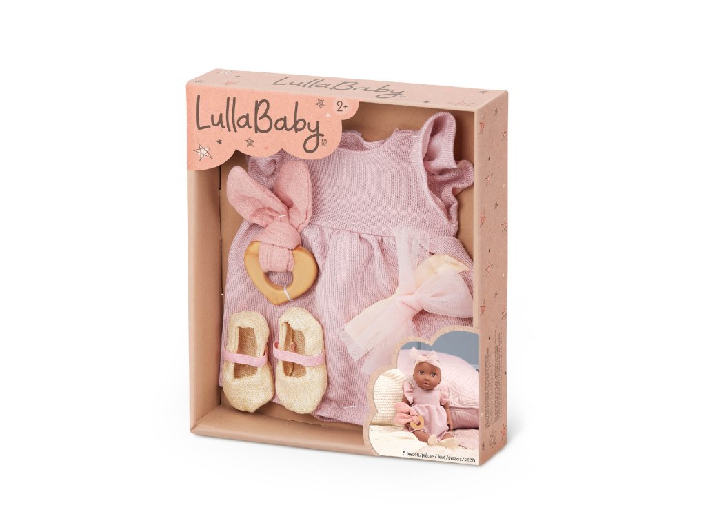 Tento stylový set pro panenky LullaBaby obsahuje romantické šatičky, čelenku, botičky a kousátko, díky kterým bude panenka připravená na den plný her a dobrodružství. Děti si mohou při oblékání své panenky rozvíjet jemnou motoriku i sociální dovednosti. Šatičky jsou navrženy s ohledem na snadné oblékání – díky jednoduchému zapínání to zvládnou i ti nejmenší. Vhodné pro většinu panenek velikosti 35 cm. Panenka není součástí balení. Vhodné pro děti od 2 let.Doplňkové parametry