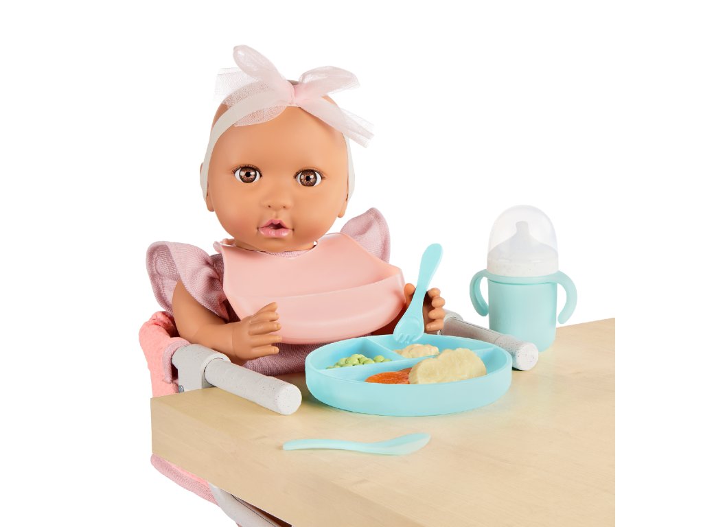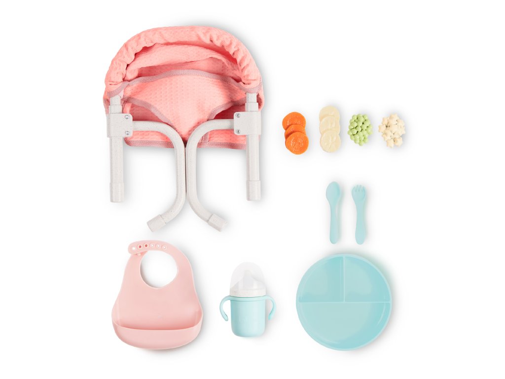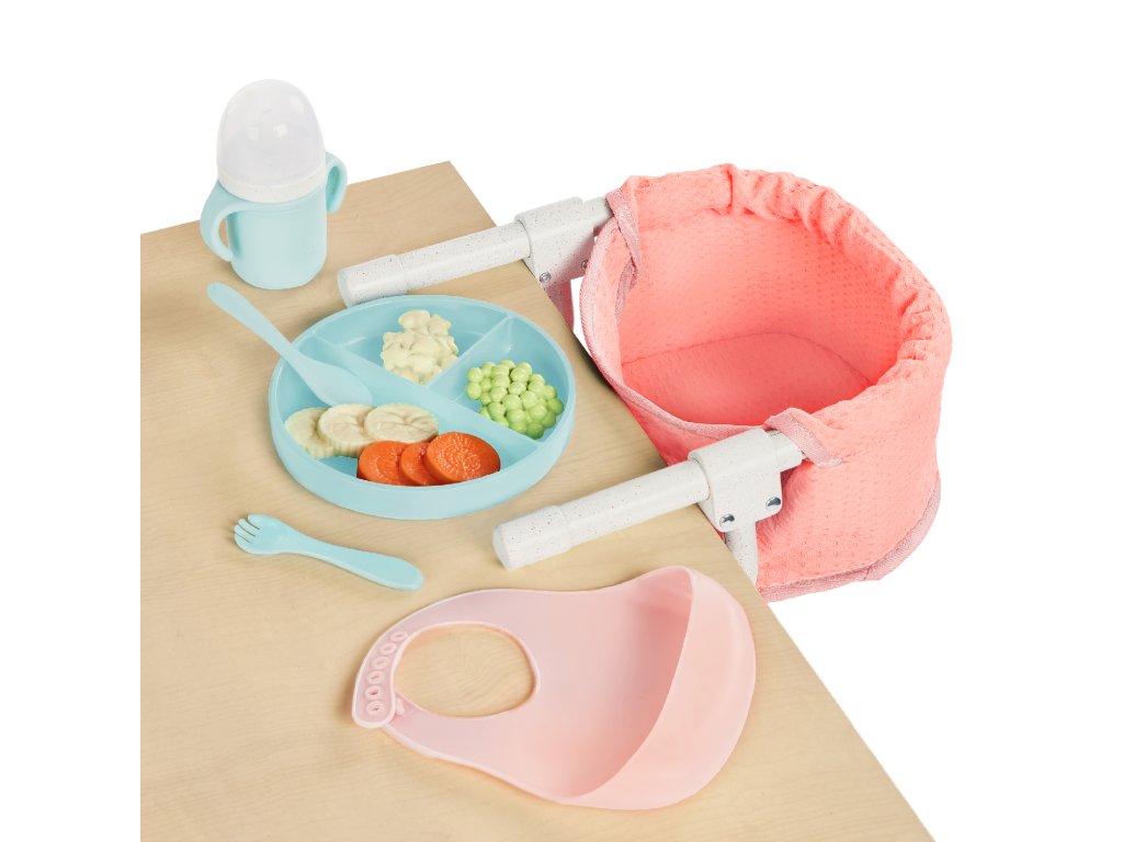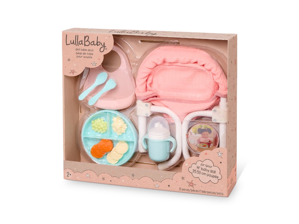Dopřejte panence vašeho dítěte místo u stolu s praktickou jídelní židličkou LullaBaby, kterou snadno připevníte k desce stolu! Židlička je navržena tak, aby pasovala na většinu stolů o tloušťce cca 2,5 cm – upevnění zvládnou i děti. Hraní s panenkou a její krmení pomáhá rozvíjet empatii a jemnou motoriku dítěte. Sada obsahuje židličku, hrneček s odnímatelným víčkem, vidličku, lžíci, talíř, cereálie, hrášek, kolečka mrkve, kolečka banánů a bryndáček. Vhodné pro většinu panenek velikosti 35 cm. Rozměry židličky: 19 x 9,5 x 21,6 cm Panenka není součástí balení. Vhodné pro děti od 2 let.Doplňkové parametry