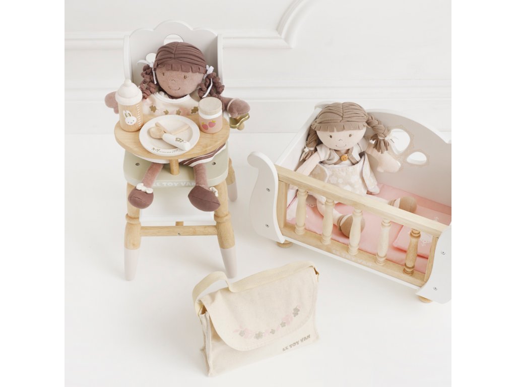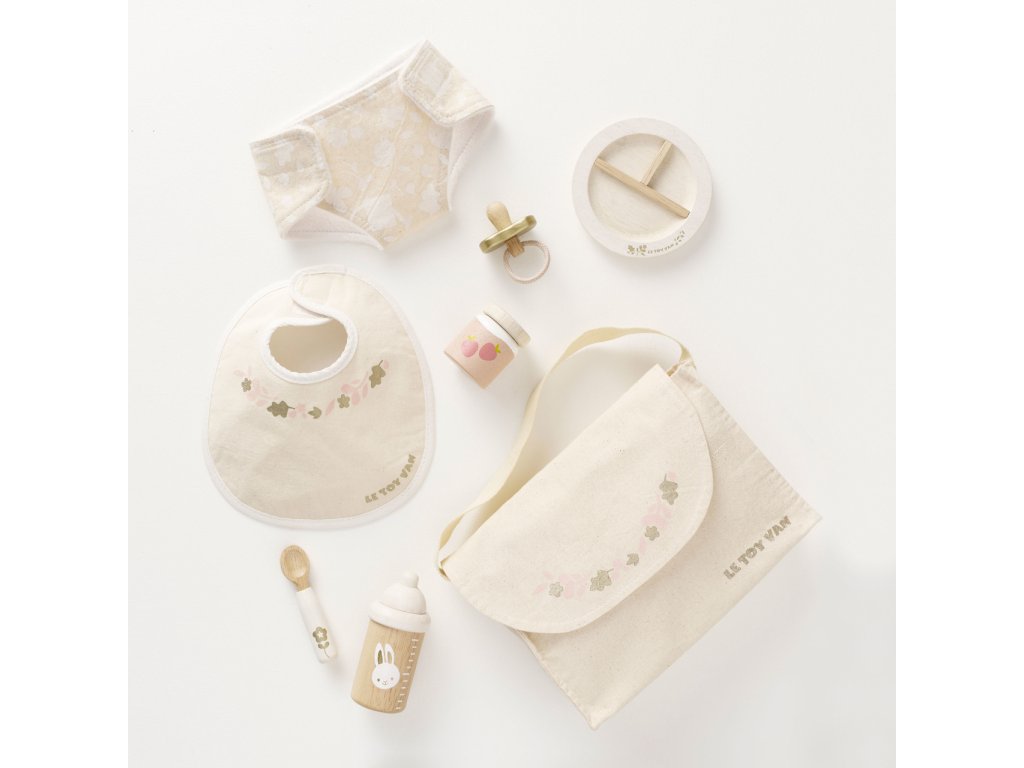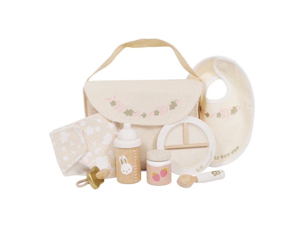 Představivá sada pro malé pečovatele a pečovatelky. Tato krásná souprava obsahuje vše, co budou děti pro péči o plyšáky a panenky potřebovat. V balení roztomilá textilní přebalovací taška s popruhem, s ozdobnou ilustrací listů. Uvnitř najdete všechny nezbytnosti, dudlík, bryndák, plenku, talíř, lžíci, přesnídávku a lahvičku. Vyrobeno s láskou z kombinace přírodní bavlny a pevného dřeva. Všechny doplňky jsou vhodné pro plyšáky a panenky ve velikosti cca 30 až 35 cm. Hračky s účelemVšechny hračky firmy Le Toy Van jsou vyrobeny s cílem – aby dlouho vydržely. Designovány s láskou zkušenými řemeslníky za použití etických praktik a udržitelných materiálů, které jsou laskavější k naší planetě. Hlavní vlastnosti: pro plyšáky a panenky ve velikosti cca 30 až 35 cmvyrobeno eticky z udržitelného dřevamalováno netoxickými barvami na bázi vodytestováno dle nejpřísnějších standardůpodporuje představivost, hraní na rolepomáhá s rozvojem řeči a sociálních dovedností Ocenění hračky:Independent Toy Gold Award 2021 Honeybake kolekce: Hračky v této kolekci jsou vhodné k objevování, pomohou dětem s rozvojem představivosti, sociálních a verbálních dovedností a kognitivních funkcí. Tradiční design s moderními detaily děti jistě bude bavit. Honeybake je kolekce Le Toy Van, která vyhrála nejvíce ocenění, a to za design, kvalitu, bezpečnost a také za vzdělávací a herní hodnotu.Sizing info