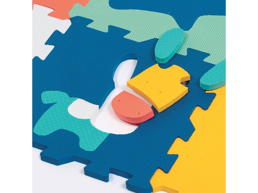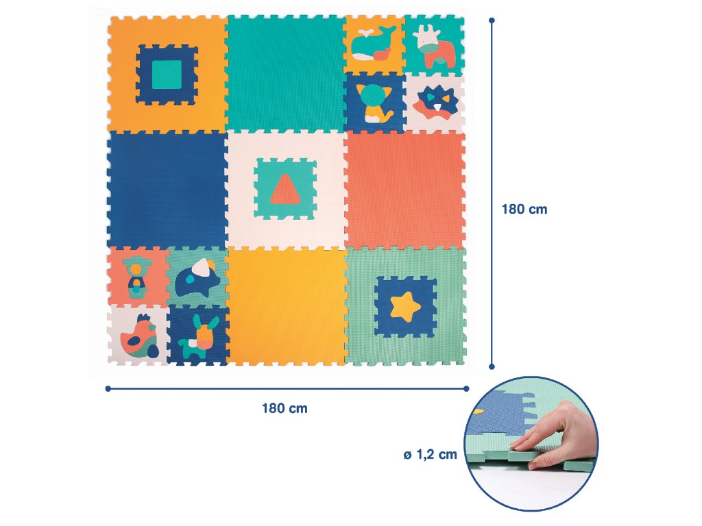 Sada extra velkých různobarevných pěnových puzzlí Ludi s vyjímatelnými zvířátky slouží ke hraní i jako hrací podložka a dekorace do dětského pokoje. Různé textury, barvy a motivy podporují rozvoj smyslů, motorických dovedností a představivosti dítěte. Ve starším věku dítěte se s jejich pomocí může učit poznávat zvířata i geometrické tvary. Materiál je ohebný, odolný, tlumí nárazy a tepelně izoluje. Rozměry celkové: 180 x 180 x 1,2 cm Rozměry jednoho dílu: 60 x 60 x 1,2 cm Složení: 100% EVA Vhodné pro děti od 10 měsíců.Doplňkové parametry