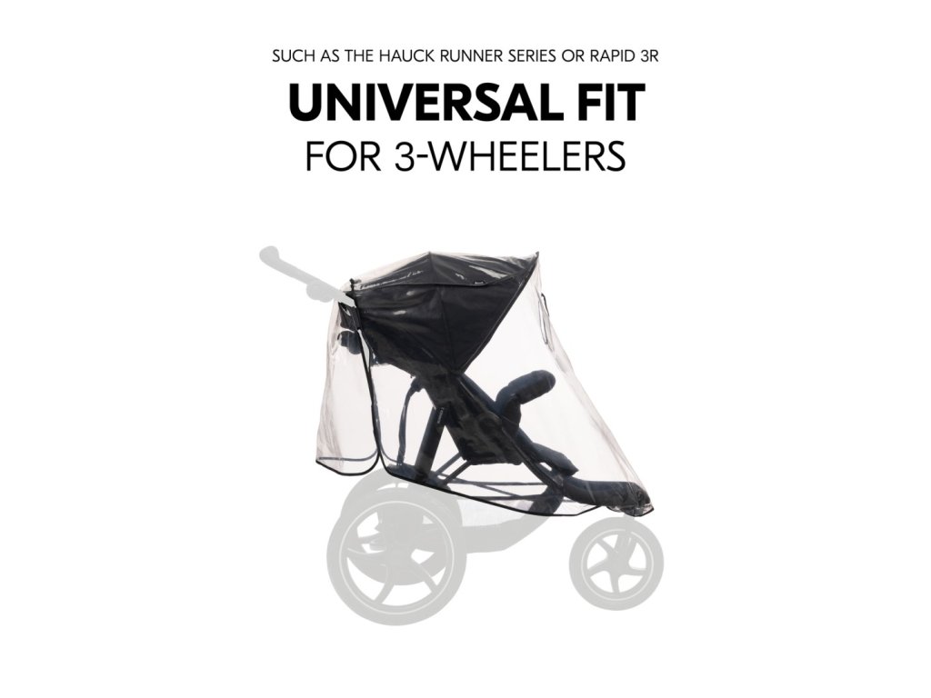 UNIVERSÁLNÍ POUŽITÍ PRO 3-KOLOVÉ KOČÁRKY // Pláštěnka je kompatibilní s většinou tříkolových kočárků, od zn. Hauck : řada kočárků Runner nebo Rapid 3R.