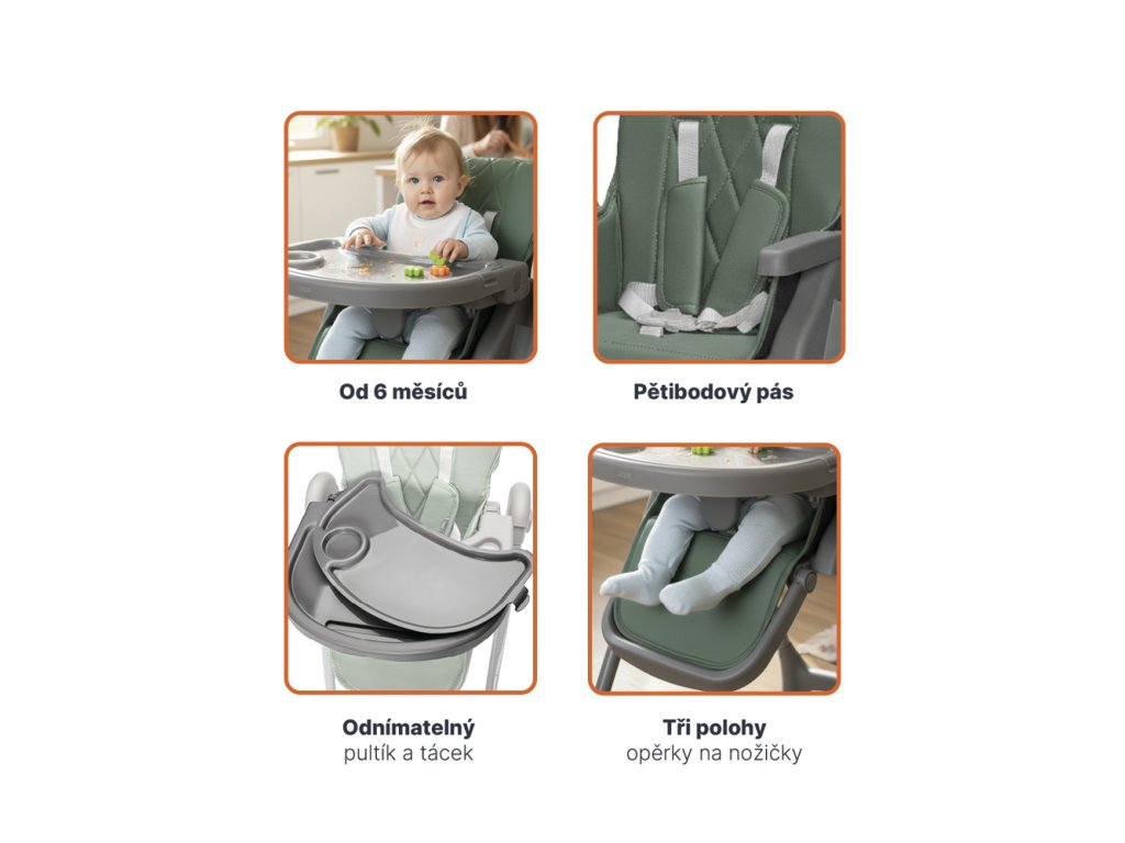 - Odnímatelný pultík s tácem pro snadné krmení i čištění