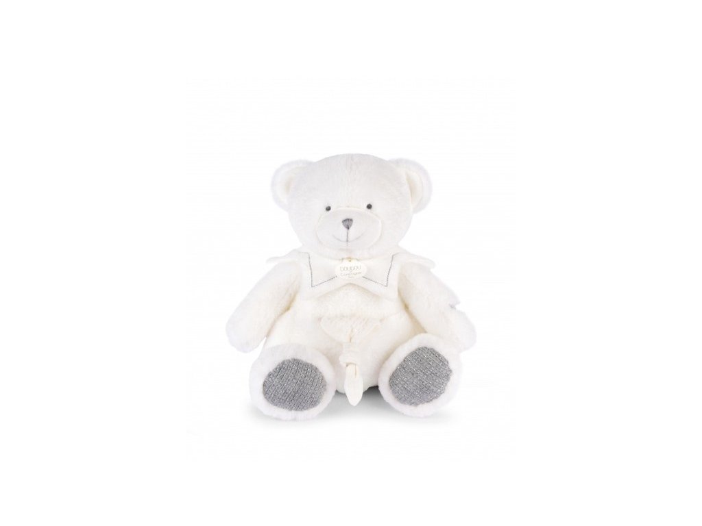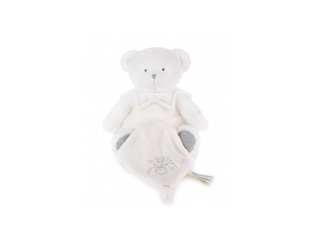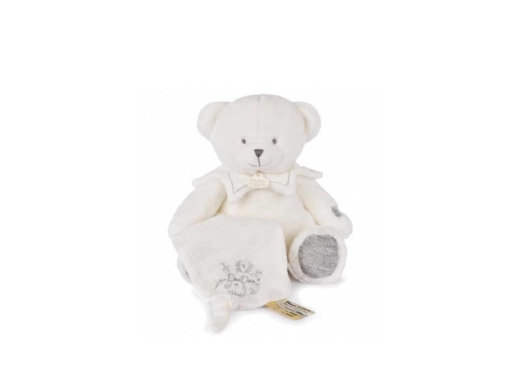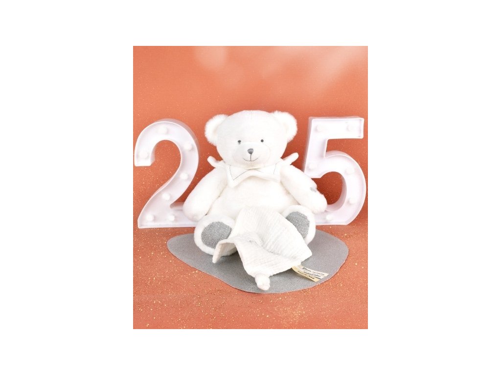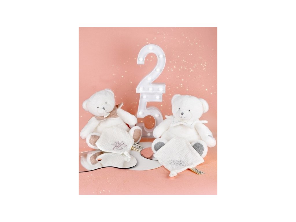 Plyšový medvídek je ideálním dárkem pro děti již od narození. Součástí medvídka je měkoučká dečka, která je skvělá k mazlení a může pomoci miminku snadněji usnout. Dečku lze jednoduše schovat do bříška medvídka, což je praktické při cestování nebo ukládání. Je ozdobená jemnou výšivkou značky Doudou a saténovými stuhami s láskyplnými vzkazy ve francouzštině, které dodávají každému mazlení ještě něžnější pocit. Medvídek má stylové šedé srdíčko na tlapce, roztomilý bílý límeček pod krkem a hebké šedé tlapky, které mu dodávají něžný a přátelský vzhled. Díky jemným, trendovým barvám a kvalitním, hebkým materiálům je ideální pro malé děti, kterým přináší pocit bezpečí a pohodlí. Perfektní tip na dárek, který potěší a zároveň stimuluje smysly Vašeho miminka. Údržba: Perte v lázni na 30°. Přirozené nebo nízkoteplotní sušení. Hlavní vlastnosti: měkký plyš, prémiový materiálvhodné od narozenív souladu s evropskými normami CEideální jako dárekpraktická dárková krabičkaSizing info