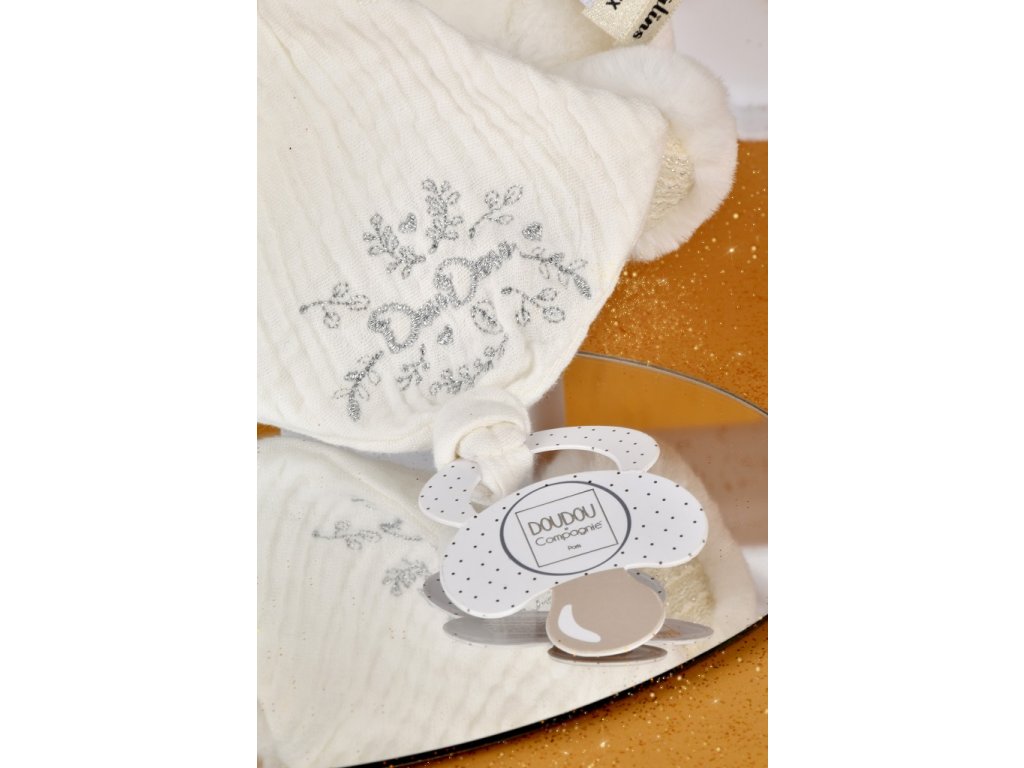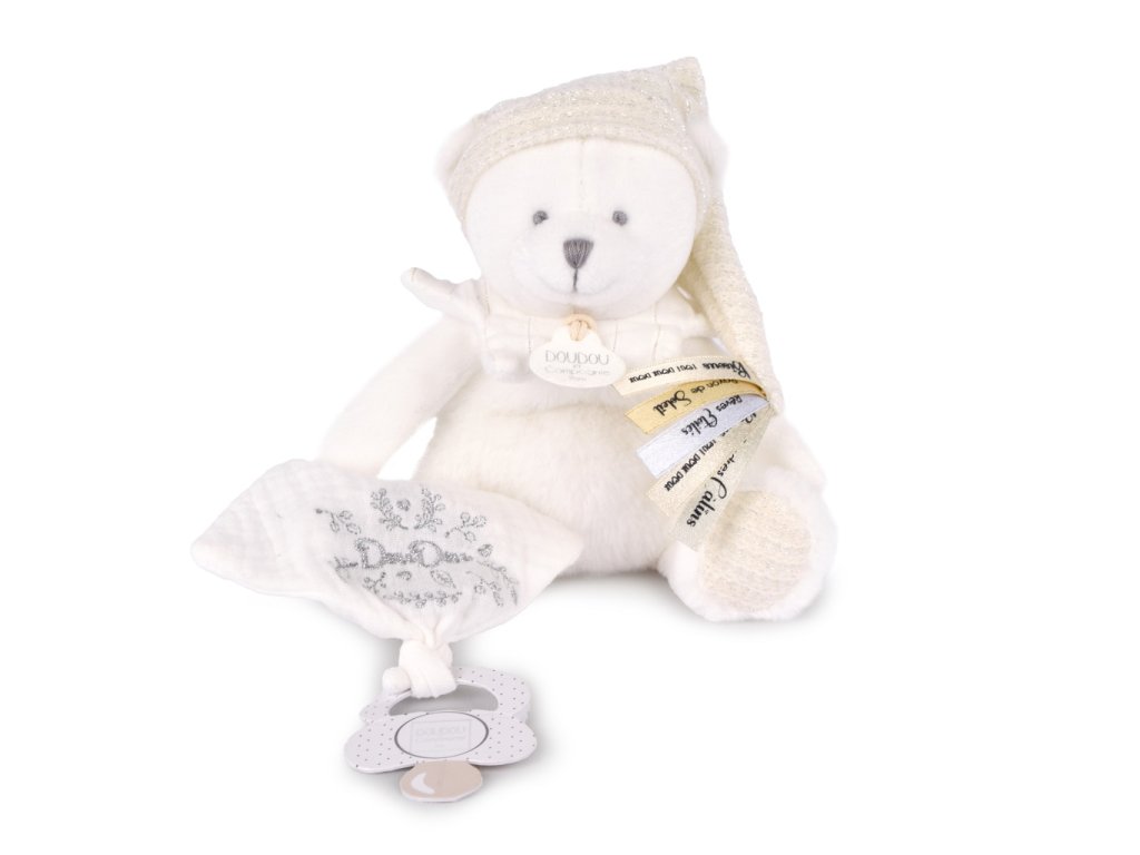 Doudou Dárková sada Plyšový medvídek s úchytem na dudlík a dečkou béžový 20 cm