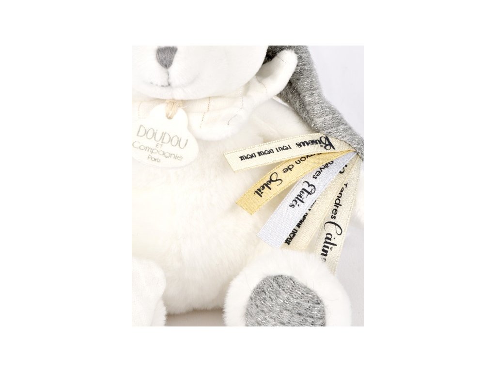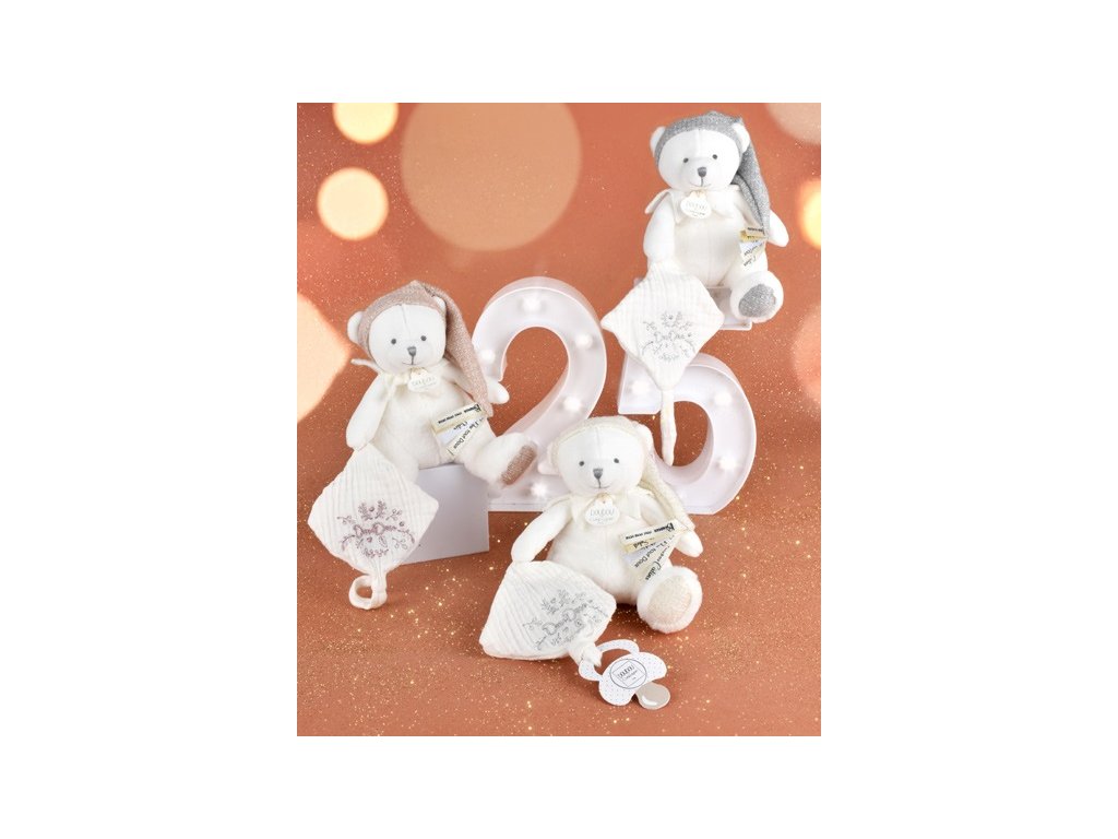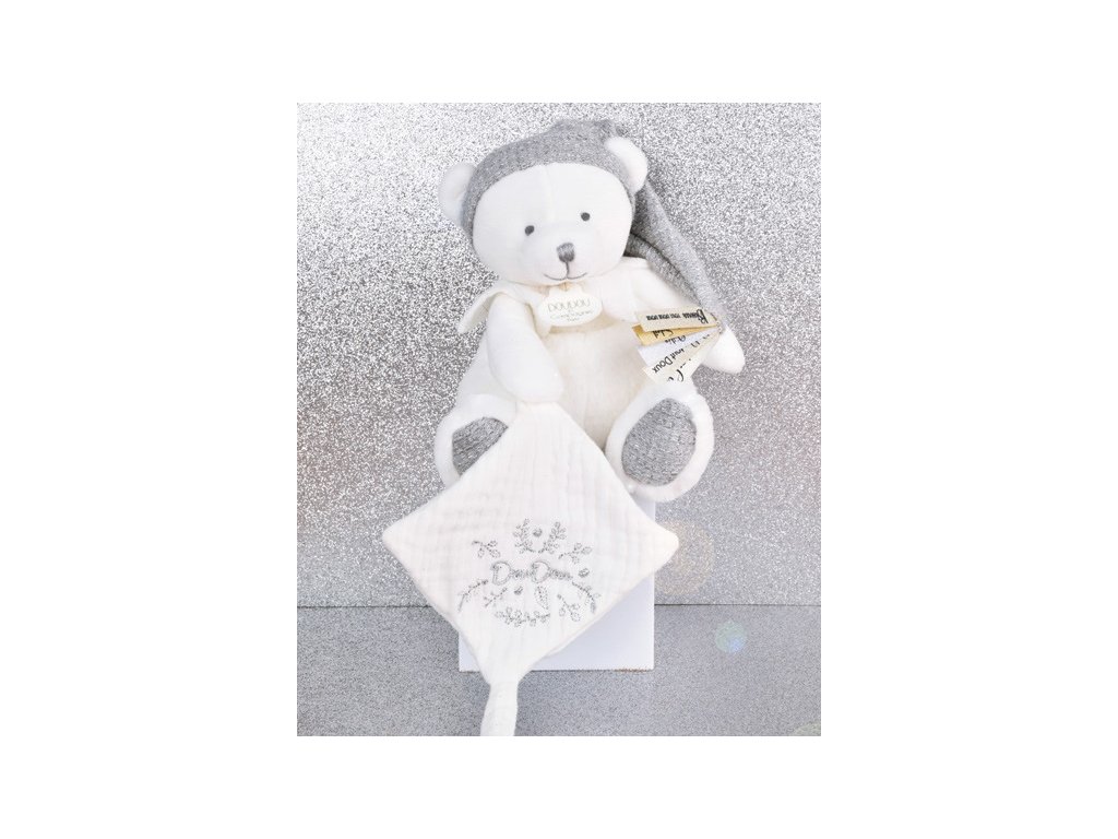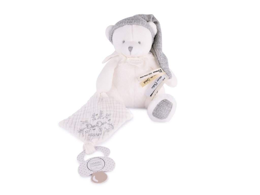 Doudou Dárková sada Plyšový medvídek s úchytem na dudlík a dečkou šedý 20 cm
