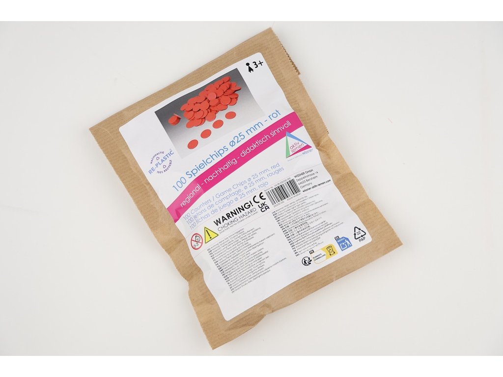 Univerzální herní žetony vhodné jako doplněk ke společenským a výukovým hrám. Podporují rozvoj porozumění množství, třídění a porovnávání. Ideální pro počítání, bodování nebo vizuální znázornění úloh. Vyrobeno ze 100% recyklovaného plastu, který je po použití opakovaně recyklovatelný. Zabaleno v uzavíratelném papírovém sáčku s certifikací FSC. Hlavní vlastnosti: 100 červených žetonůvhodné pro školní i domácí použitírozvíjí počítání a vnímání množstvívyrobeno v NěmeckuSizing info
