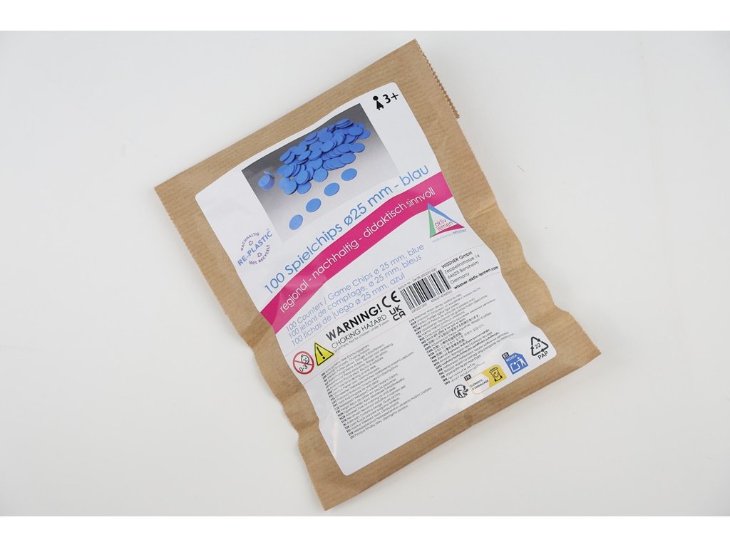 Univerzální herní žetony vhodné jako doplněk ke společenským a výukovým hrám. Podporují rozvoj porozumění množství, třídění a porovnávání. Ideální pro počítání, bodování nebo vizuální znázornění úloh. Vyrobeno ze 100% recyklovaného plastu, který je po použití opakovaně recyklovatelný. Zabaleno v uzavíratelném papírovém sáčku s certifikací FSC. Hlavní vlastnosti: 100 modrých žetonůvhodné pro školní i domácí použitírozvíjí počítání a vnímání množstvívyrobeno v NěmeckuSizing info