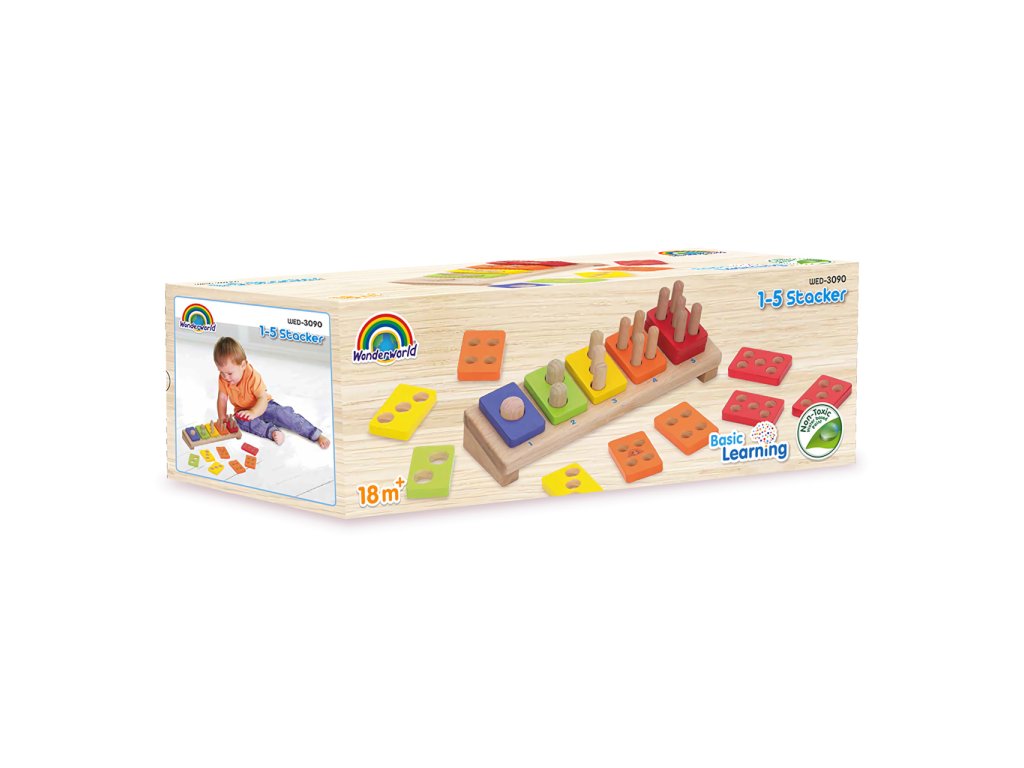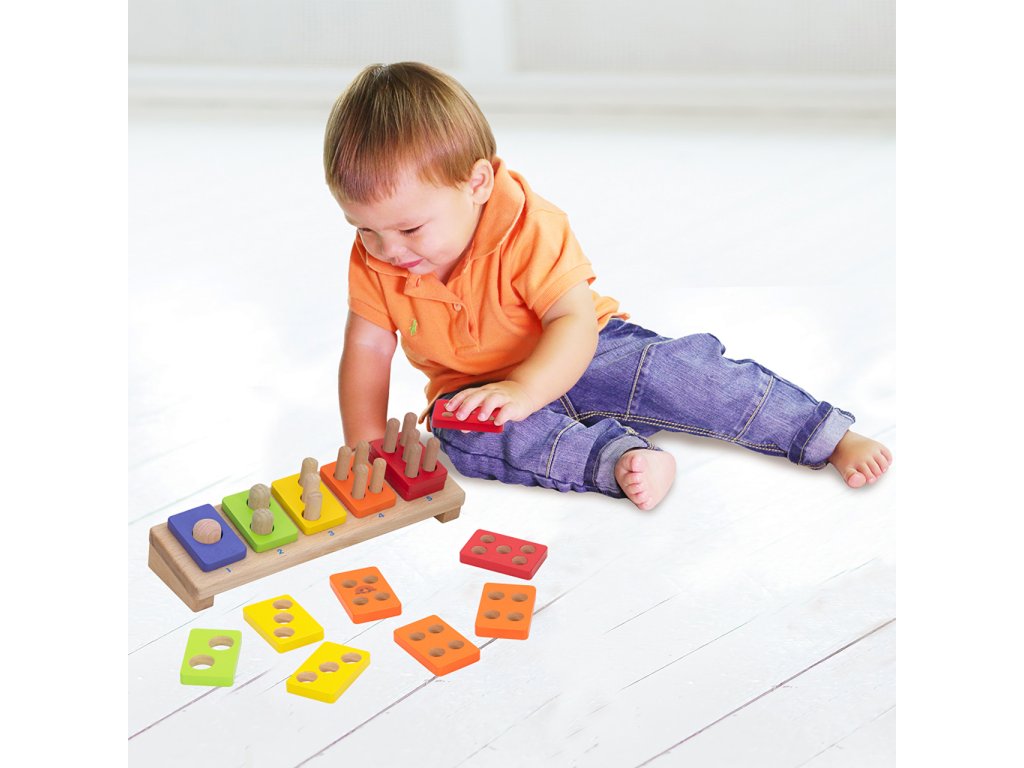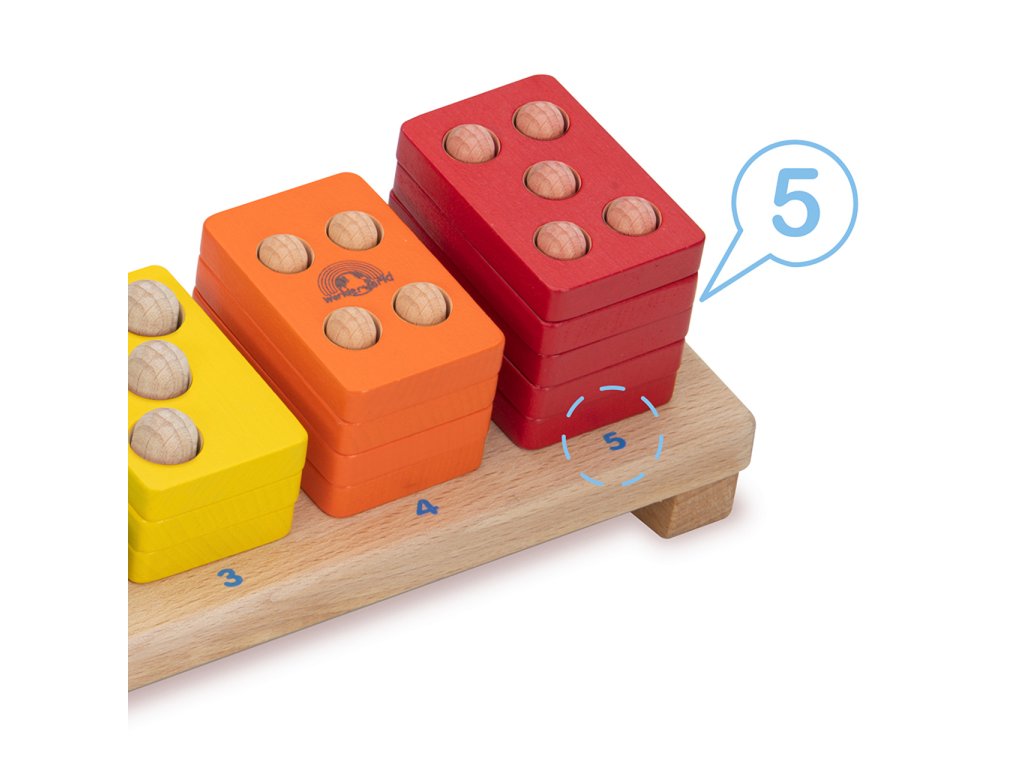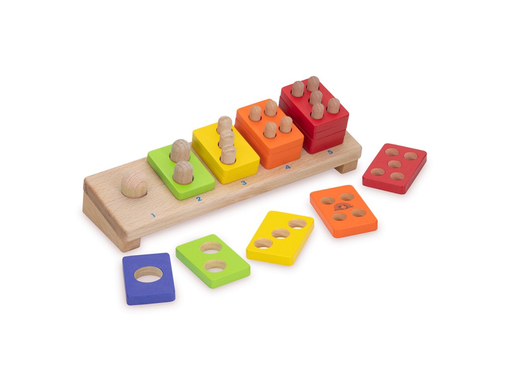 S přispěním výrazných barev pomůže tato jednoduchá skládačka dětem přirozeně pochopit význam čísel a naučit se základnímu počítání. Nasazováním destiček děti mohou navíc rozvíjet i jemnou motoriku. Hračka je robustní, vyrobená z odolného masivního dřeva. Hlavní vlastnosti:základna a 15 dílků skládačkyodolné provedení z masivního dřevavytříbená barevnost a povrchová úpravaSizing info