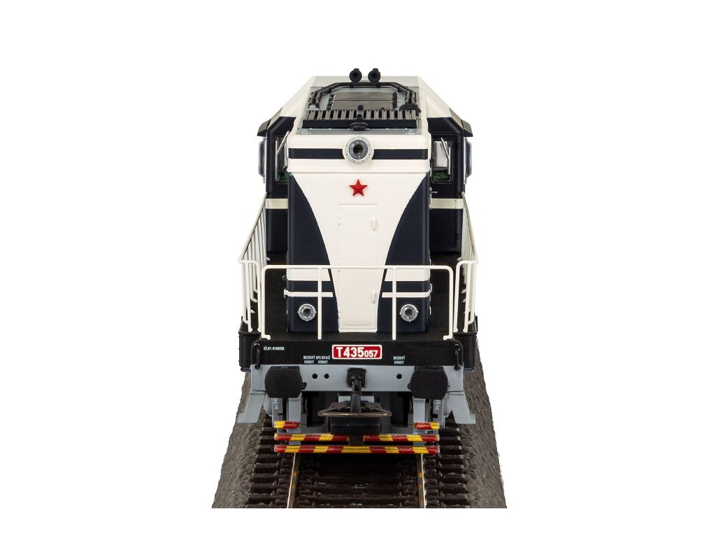 Dieselová lokomotiva T435 057 Hektor ČSD Hektor s Pensylvánskými podvozky: Tištěná varianta V 75 jako T 435 ČSD v éře III (1949-1968). Model má moderní rozhraní PluX22 pro snadné dovybavení dekodéru. V druhé polovině 50. let 20. století Deutsche Reichsbahn viděla potřebu v krátké době nahradit parní lokomotivy třídy 80. Vzhledem k tomu, že v 60 se v NDR stále ještě zkoušely lokomotivy z řady 80, bylo 20 jednotek již z osvědčené řady T 435 v provozu. Lokomotivy, které byly zpočátku označeny jako V 75 (později třída 107), byly především stroje používané především v Lipsku a jeho okolí v posunovací službě. Model přesvědčí mnoha detaily, např. věrnou realizací malého modelu. Malá lampa v kabině strojvedoucího podle modelu DR, osvětlená lokomotiva osvětlené poznávací značky lokomotivy, jemná reprodukce pohonu rychloměru (typické pro Reichsbahn) a reprodukce konstrukce brzd. Kliky a zábradlí jsou stejně filigránské jako robustní. Vynikající celkový vzhled ještě umocňuje živě vyvedená trojrozměrná rytina na přední části lokomotivy. Osvětlení pomocí LED diod. Standardní osvětlení kabiny strojvedoucího, stejně jako směrové zadní světla (lze ovládat digitálně pomocí dekodéru PluX22), která fungují v závislosti na směru jízdy, a osvětlená lokomotiva. Výkonný pětipólový motor se dvěma setrvačníky, dvěma trakčními pneumatikami a těžkým rámem ze zinkového tlakového odlitku zajišťují plynulý chod a vysokou tažnou sílu. Hlavní vlastnosti: analogové ovládánínapájení DCregistrační číslo OEEZ: DE 24216800napájecí systém - stejnosměrný proudepocha IIIdigitální rozhraní - NEM 658 PluX22zvuk - dekodér lze dovybavitpočet trakčních pneumatik - 2spojka - hřídel NEM + těsný pojkový článeksvětlo - ANO bílá/červená, dle směru jízdyzvláštnost: osvětlená SPZ - lze ovládat pouze digitálněvhodné od 14+Sizing info