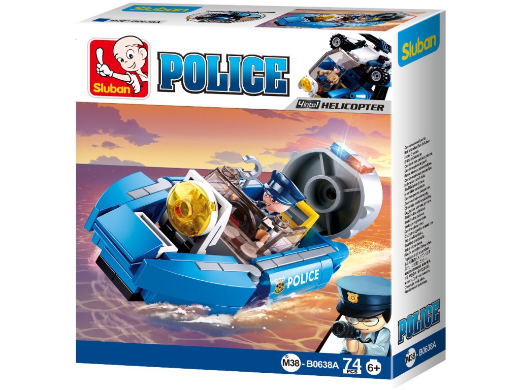 Ministavebnice policejní techniky ze série Policie 4into1, jejíž kompletací vznikne možnost sestavit velký ucelený model helikoptéry. Inovativní stavebnice Sluban je možno kombinovat s podobnými stavebnicemi mnoha dalších významných výrobců. Jsou vyráběny z kvalitního, nezávadného a odolného ABS plastu. Každá stavebnice je opatřena návodem k sestavení a balena v pestře potištěné papírové krabičce. Hlavní vlastnosti:74 dílků, 1 figurkastřední obtížnostkompletací série lze sestavit velký modelinovativní figurky s otáčivými i výkyvnými částmi tělkompatibilní se stavebnicemi dalších výrobcůSizing info
