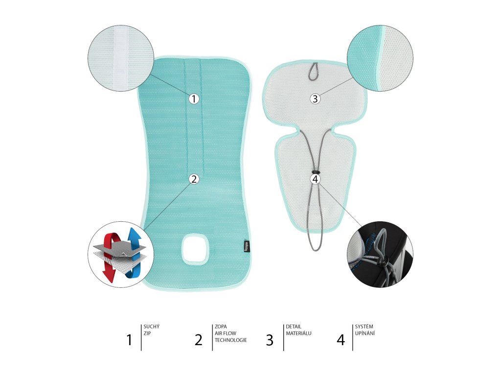 Prodyšnost zajišťuje unikátní technologie Zopa Air Flow, látka s 3D hexagon strukturou dovolující skrz vložku proudění vzduchu mezi autosedačkou a dítětem.
