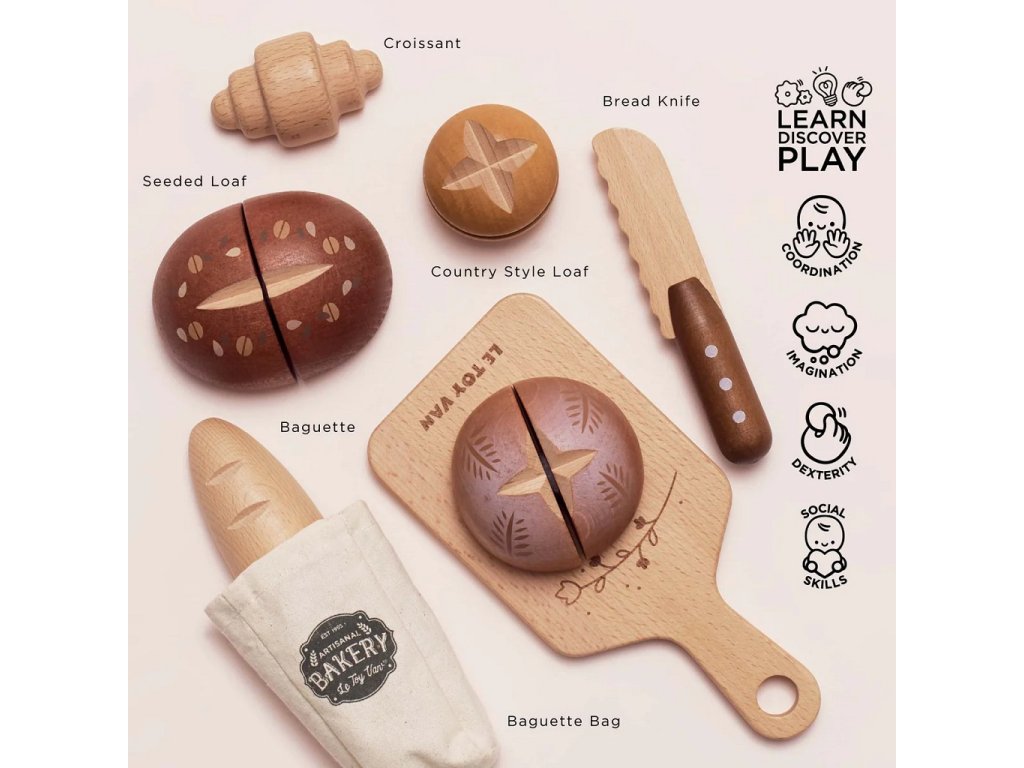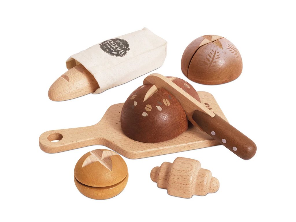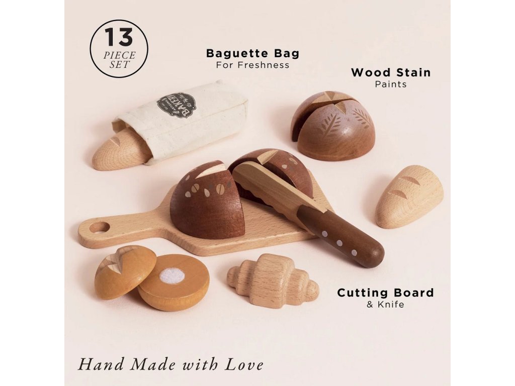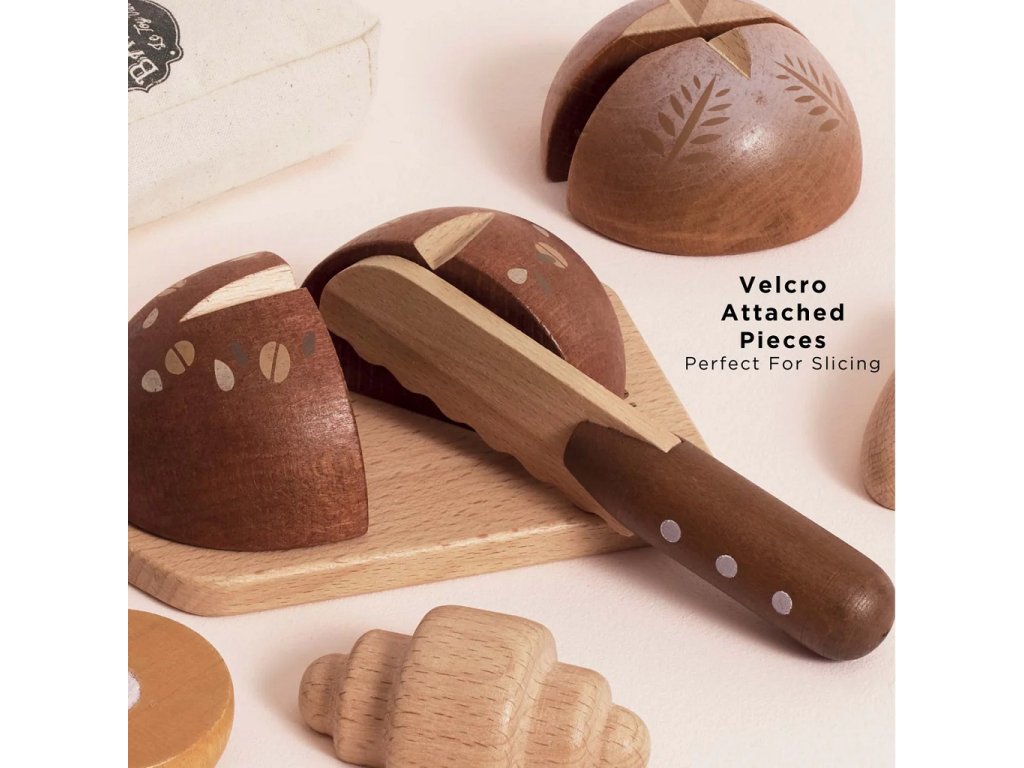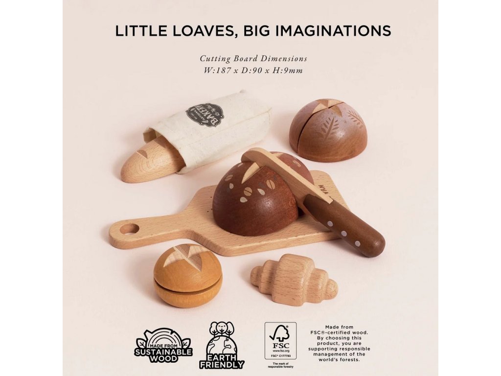 Přiveďte do dětského pokojíčku atmosféru malé pekárny nebo tržnice. Ideální vola pro malé pekaře a kreativní děti. Tento krásně zpracovaný dřevěný set zahrnuje různé druhy pečiva: semínkový chléb, country-chléb, housku, croissant i bagetu. Součástí je také měkký látkový pytlík, dřevěný nůž a dřevěné prkénko s rytými detaily. Pečivo je spojeno suchý zipem.Jedná se o ekologickou, udržitelnou hračku vyrobenou ze dřeva s certifikací FSC®. Materiál je pevný, přírodní a zodpovědně získaný. Povrch je upraven netoxickými barvami na vodní bázi, což je bezpečné pro děti. Tento set podporuje prostorovou představivost, kreativitu a jemnou motoriku. Děti si mohou hrát na pekárnu, obchod, domácí kuchyň nebo tržnici, sdílet hraní s kamarády či sourozenci, nacvičovat společenské interakce a představivou hru. Hlavní vlastnosti: kompletní dřevěný pekárenský set pro dětiobsahuje semínkový chléb, country chleba, housku, croissant, bagetu, látkový pytlík, dřevěné prkénko a nůžrealistické krájení díky suchým zipůmvyrobeno z FSC® certifikovaného dřeva Podporuje kreativitu, představivost a jemnou motorikurozvíjí fantazii, sociální dovednosti a koordinaci Značka a certifikát FSC® (Forest Stewardship Council) zaručuje, že dřevo, ze kterého byl produkt vyroben, nebylo vytěženo nelegálně a pochází z lesů obhospodařovaných šetrným či přírodě blízkým způsobem, ve kterém jsou dodržovány přísné environmentální a sociální požadavky. Značka FSC® na výrobku znamená, že svým nákupem pomáháte chránit lesy a podporujete šetrné, odpovědné či přírodě blízké hospodaření, díky kterému jsou naše lesy stabilnější, zdravější, mají přirozenou druhovou skladbu a lépe odolávají negativním následkům klimatických změn.Sizing info