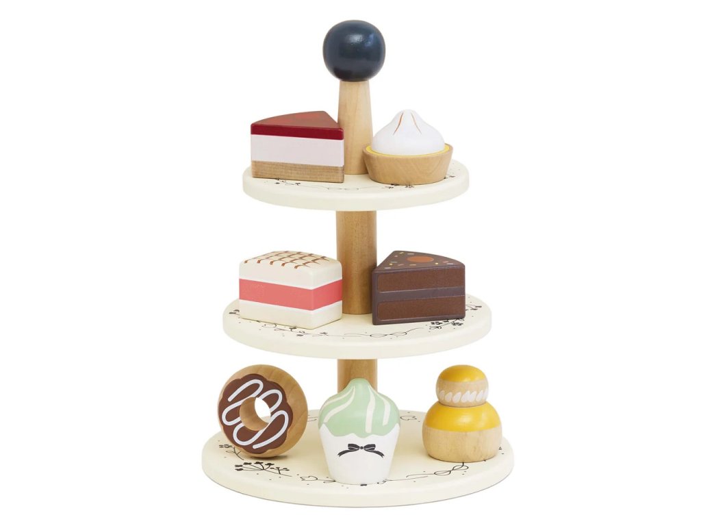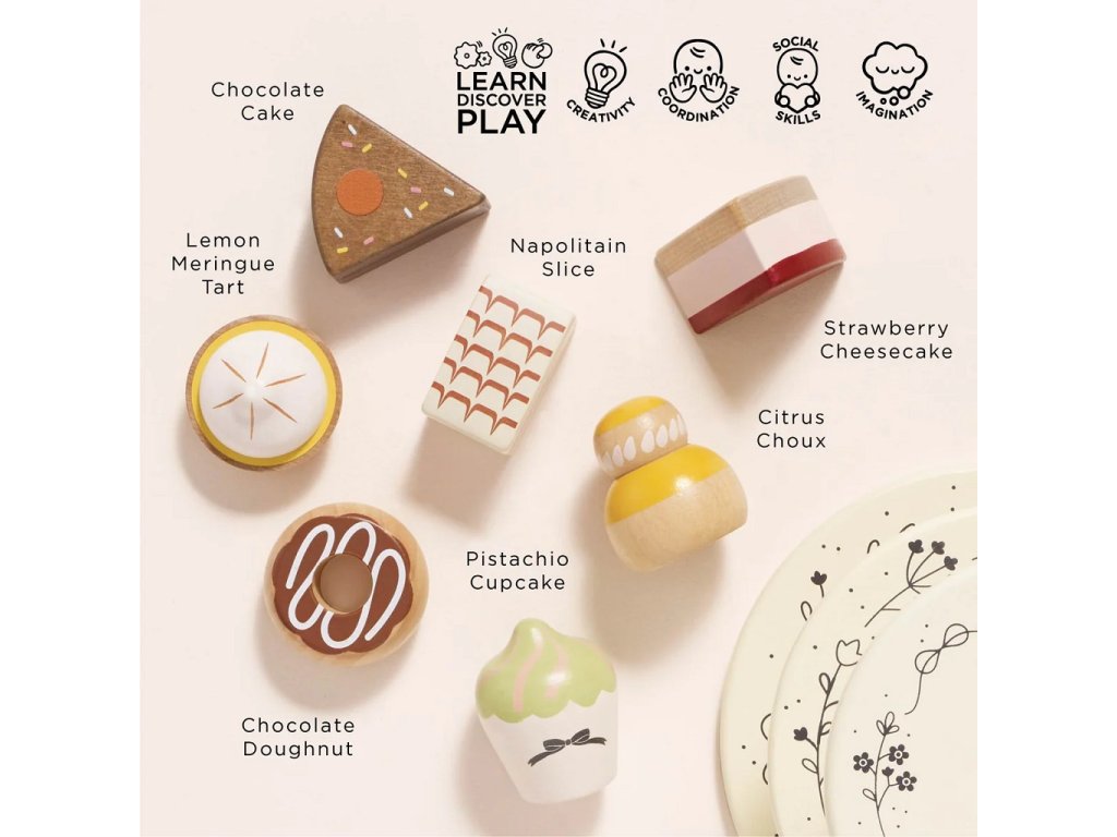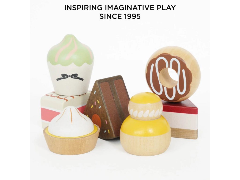 Přineste dětským hrám sladkou atmosféru a nekonečnou kreativní zábavu s tímto dokonalým doplňkem do dětské kuchyňky či herního koutku. Skvělá hračka pro malé cukráře i hospodyňky. Tento kvalitní stojan na dorty je ručně vyroben ze dřeva z udržitelných zdrojů, ekologicky lakován netoxickými vodovými barvami a plně bezpečný pro děti. Každé z tří pater je krásně zdobeno. Stojan je navržen tak, aby dokonale ladil s dalšími dřevěnými hračkami a doplňky.Součástí setu je 7 detailně zpracovaných dřevěných sladkostí. Hra s touto sadou sladkostí podporuje rozvoj fantazie, představivosti, jemné motoriky a sociální hry. Děti si mohou samy servírovat, krájet, nabídnout svým panenkám či kamarádům sladké pohoštění. Celý set je plast-free, šetrný k přírodě a navržen s myšlenkou dlouhodobé trvanlivosti, takže vydrží i opakované hraní.Ideální jako dárek pro děti od 3 let, ať už chcete doplnit dětskou kuchyňku, rozšířit sadu hraček nebo jen podpořit kreativitu a hraní formou role-play. Tento dřevěný stojan na dorty se snadno stane oblíbenou částí dětského herního světa. Hlavní vlastnosti: dřevěný stojan se třemi patry elegantní design 7 dřevěných dezertůvyroben z FSC® certifikovaného dřeva a netoxických vodových barev ekologický, bezpečný a vhodný pro dětipodporuje kreativitu, fantazii a jemnou motorikuskvělá pomůcka pro rozvoj sociálních dovedností a představivosti - děti si nacvičí sdílení, pohostinnost a scénáře z běžného života Značka a certifikát FSC® (Forest Stewardship Council) zaručuje, že dřevo, ze kterého byl produkt vyroben, nebylo vytěženo nelegálně a pochází z lesů obhospodařovaných šetrným či přírodě blízkým způsobem, ve kterém jsou dodržovány přísné environmentální a sociální požadavky. Značka FSC® na výrobku znamená, že svým nákupem pomáháte chránit lesy a podporujete šetrné, odpovědné či přírodě blízké hospodaření, díky kterému jsou naše lesy stabilnější, zdravější, mají přirozenou druhovou skladbu a lépe odolávají negativním následkům klimatických změn.Sizing info
