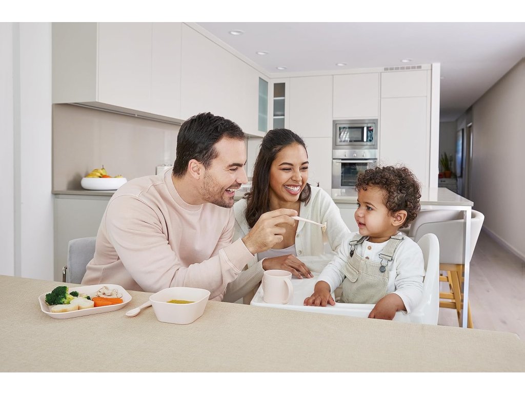 Jídelní sadu tvoří talíř, miska, hrnek se 2 uchy, pružná lžička a vidlička. Talíř i miska s vysokými okraji pomáhají snadnému nabírání pokrmu. Lžička a vidlička jsou vyrobeny z flexibilního příjemného materiálu a mají neklouzavá, kulatá držadla, která usnadňují dítěti držení. Hrnek se dvěma uchy pomáhá dítěti naučit se pít z klasického hrnku. Všechny části jídelní sady je možné mýt v myčce a používat pro ohřátí pokrmu či nápoje v mikrovlnné troubě. Složení: PP Vhodné pro děti od 6 měsíců.Doplňkové parametry