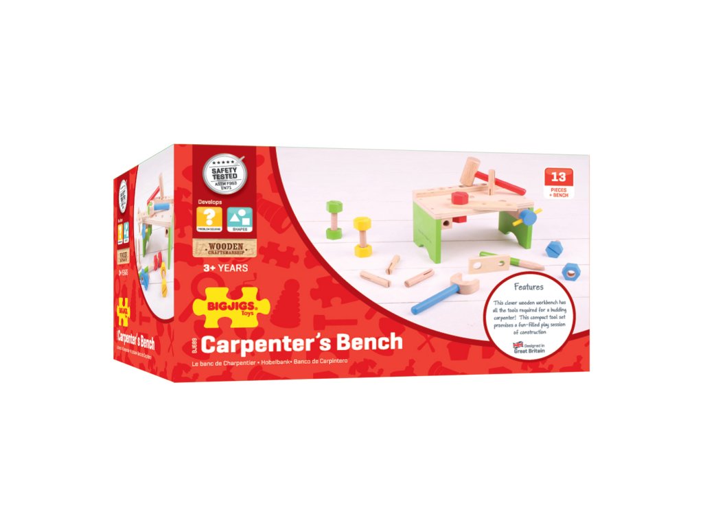 Tento chytře navržený dřevěný tesařský ponk obsahuje dřevěný klíč, kladivo a spoustu šroubů, matic a zatloukacích špalíků. Hlavní vlastnosti: vyrobeno z kvalitních materiálů, zodpovědně získaných z přírodních zdrojůodpovídá současným evropským bezpečnostním normámpodporuje koordinaci rukou a očískládá se ze 14 hracích prvkůSizing info