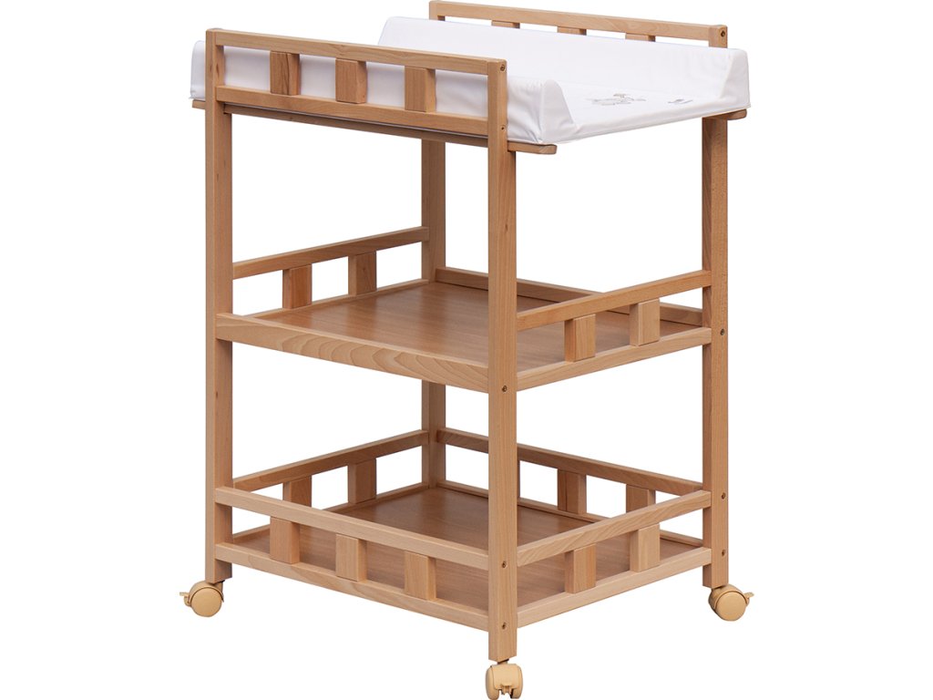 Praktický přebalovací pult se dvěmi policemi z HDF desky. Vrchní přebalovací pult z polyuretanu potažený omyvatelným PVC, vyztužený MDF deskou.