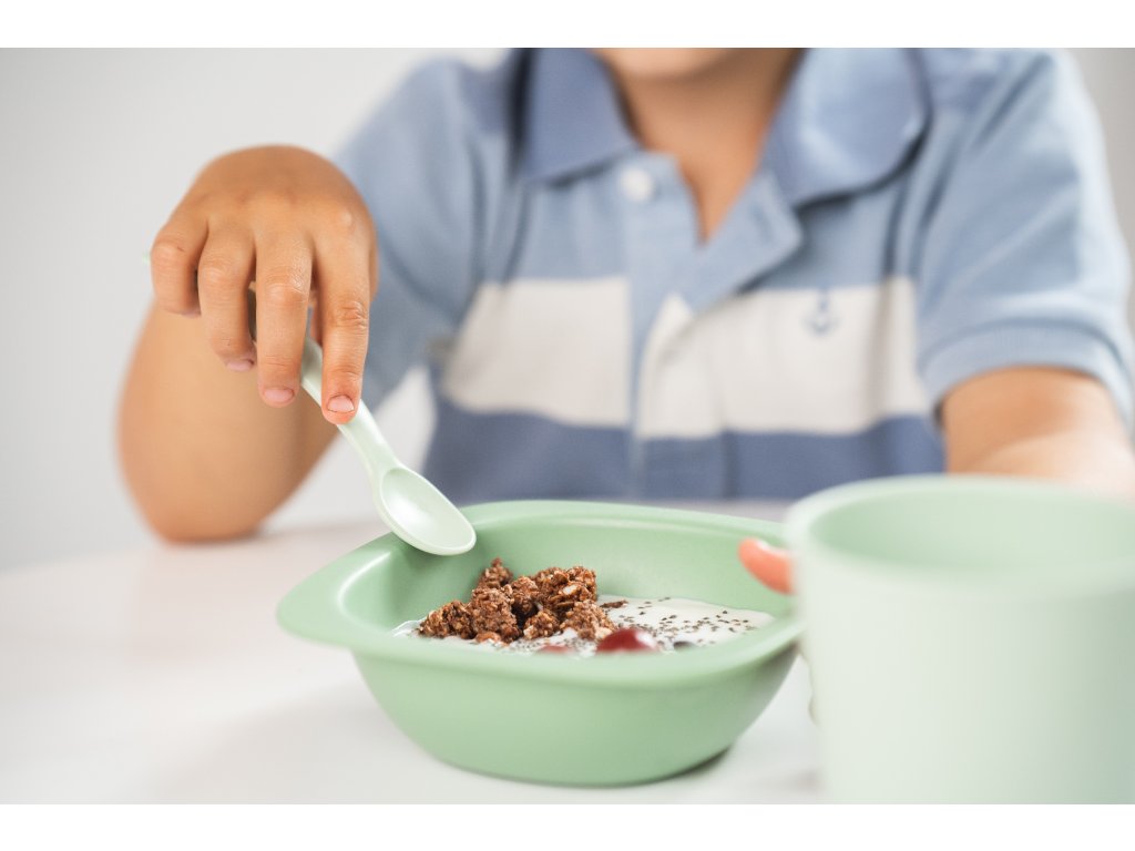Ergonomicky tvarovaná rukojeť lžičky a vidličky pro bezpečné uchopení.