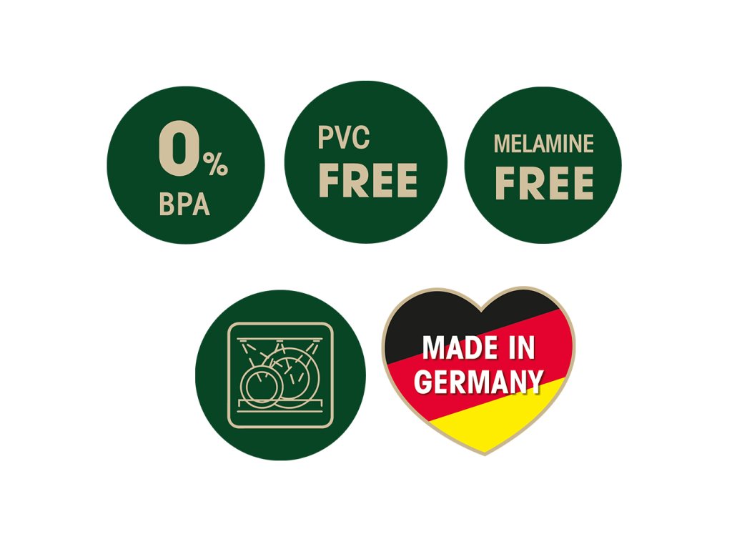 Pevný materiál neobsahuje BPA ani PVC. Lze jej mýt v myčce nádobí. Výrobek se vyznačuje kvalitou "Made in Germany".