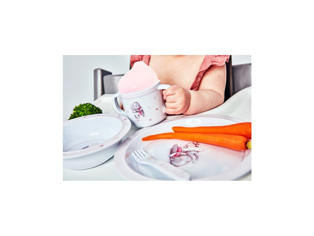Protiskluzová guma na dně talíře, misky a hrnku udrží nádobí na místě, dokud dítě nedojí.