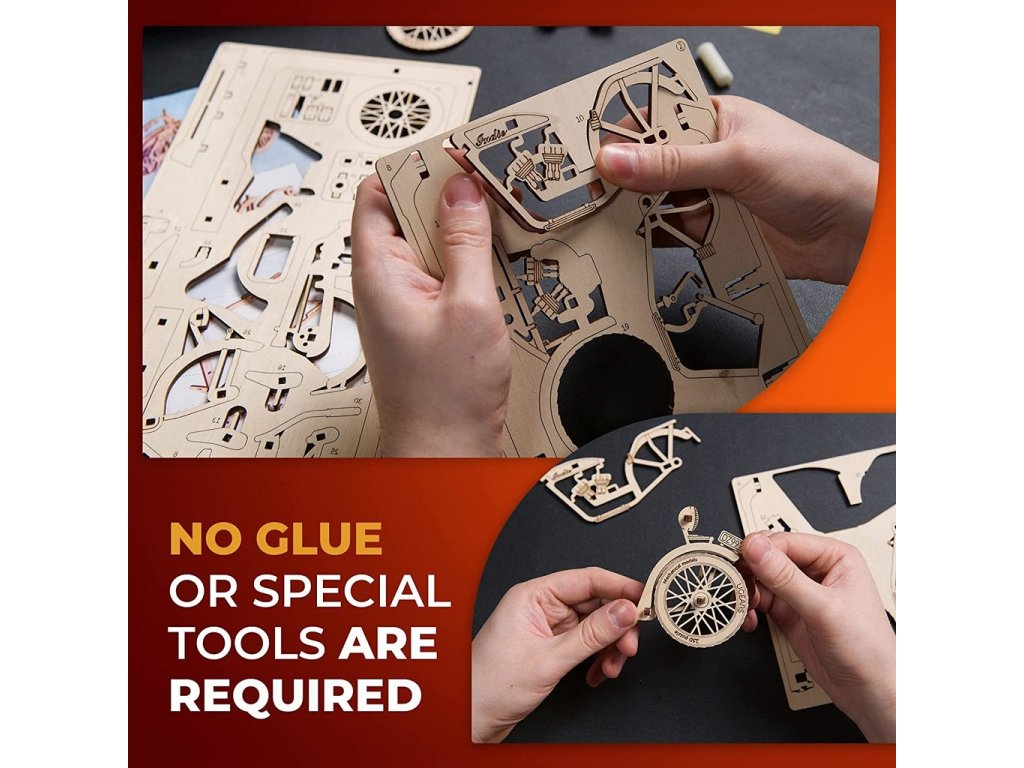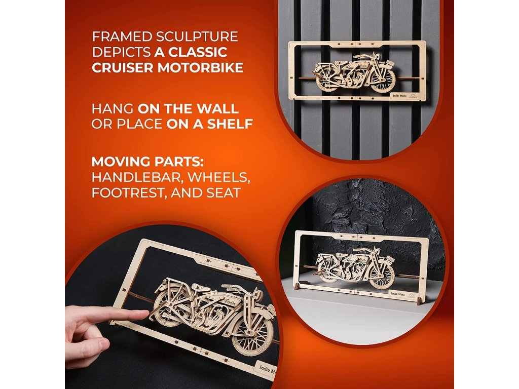 Tato stavebnice modelu motocyklu Indie Moto patří do první série z nové řady mechanických 2.5D stavebnic Classic Vehicles pro dospělé i děti. Indie Moto zobrazuje klasicky stylizovaný cruiser motocykl podobný retro motocyklům Indian. Tento model motocyklu má pohyblivé prvky, takže můžete otáčet řídítky, otáčet koly, spouštět opěrku nohou a nastavovat sedadlo, zatímco motocykl ladně sedí v dřevěném rámečku. Součásti balení je stojan na obrázek a podrobný návod s ilustrovanými pokyny. Při sestavování stavebnice není zapotřebí žádné nářadí ani lepidlo. Model je vhodný pro začátečníky a doba sestavení trvá cca 30 minut. Stačí vytlačit laserem předem vyřezané kousky z dřevěných desek a zacvaknout je k sobě, abyste vytvořili kompletní model obrazu. Výsledný model lze zavěsit na zeď nebo jím lze ozdobit pracovní stůl či polici. Skvělý dárek pro přátelé a členy rodiny, kteří milují motocykly, rychlé stroje, modelářství nebo mechanické stavebnice. Nebo pro ty, kteří si chtějí vyzdobit svůj interiér. Hlavní vlastnosti: rozvíjí jemnou motoriku, trpělivost a prostorovou představivostkvalitní materiál a zpracovánípočet dílků 42doba sestavení cca 0,5 hodinyobtížnost jednoduchánávod k sestavení je součástí balenínavrženo a vyrobeno na UkrajiněSizing info