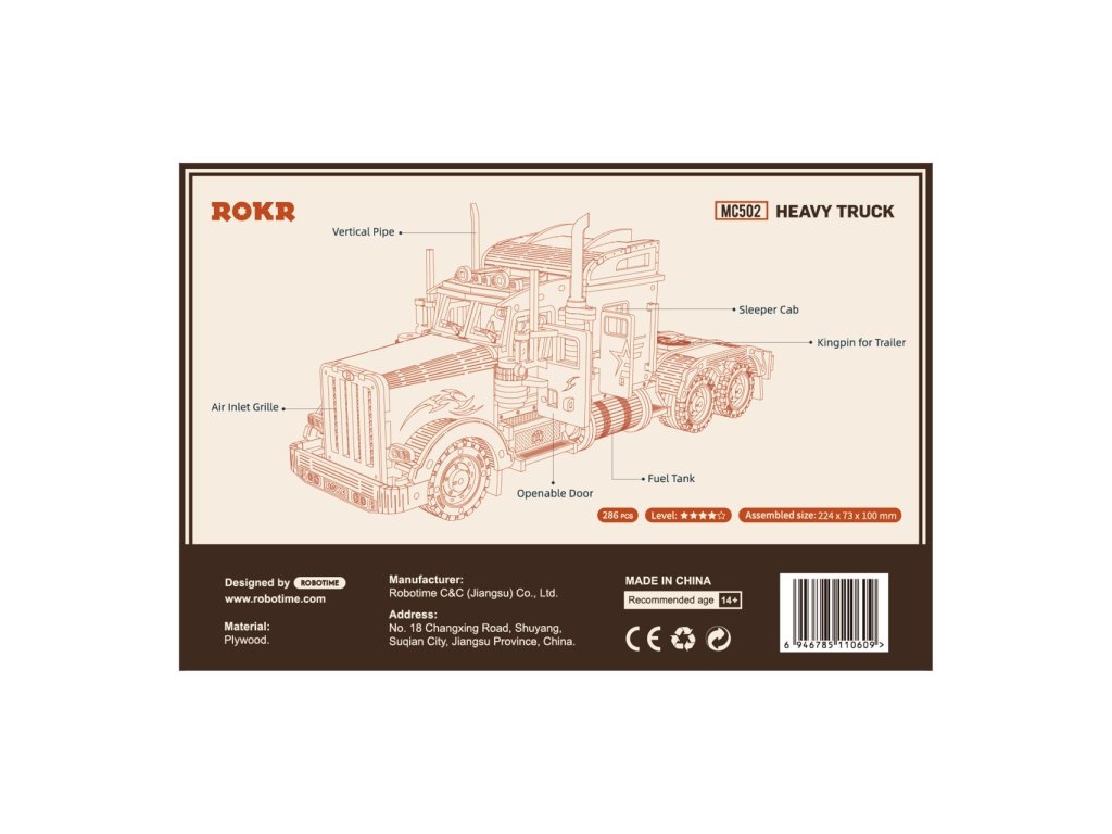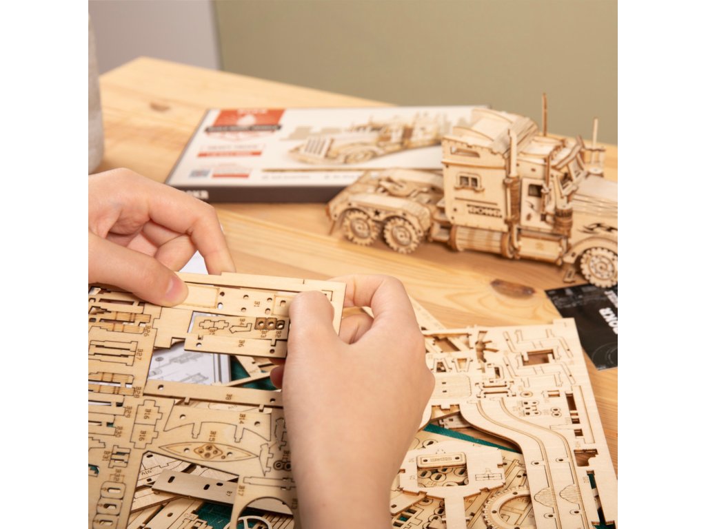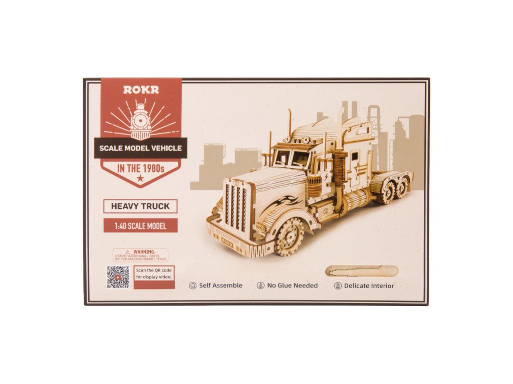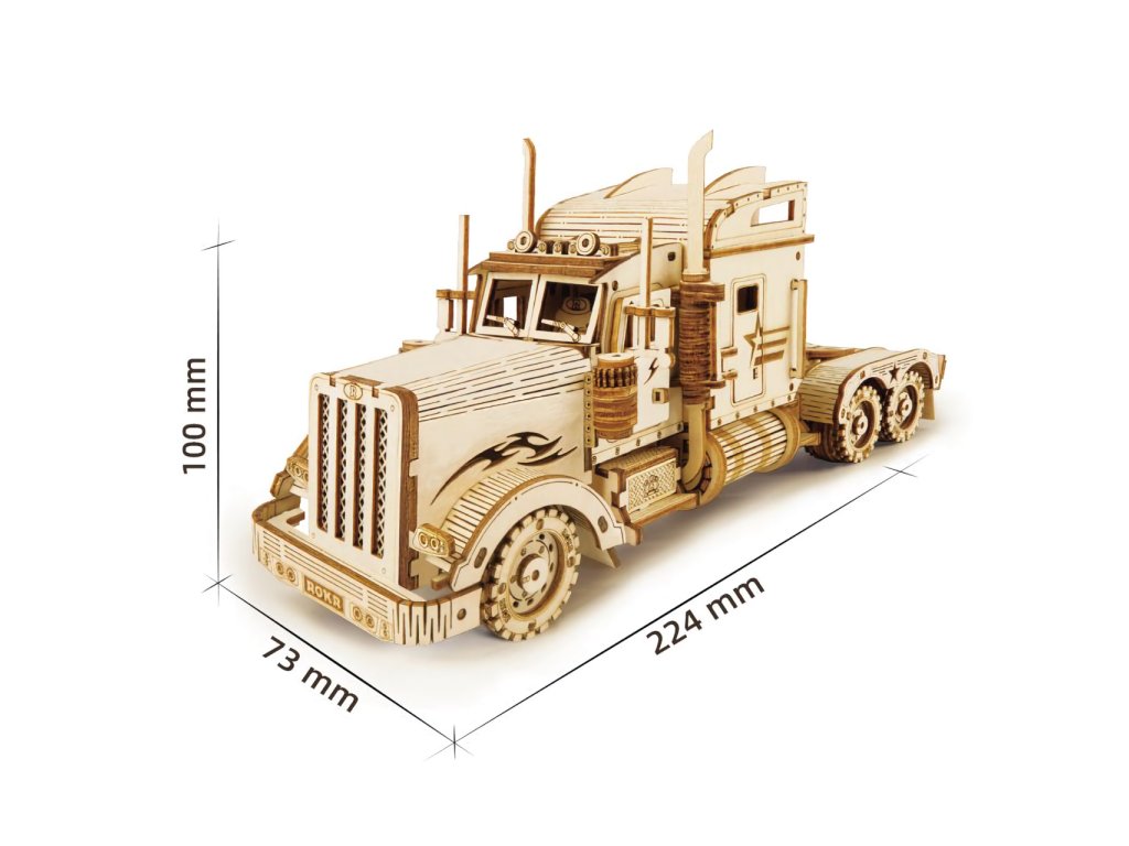 Detailní model amerického tahače v měřítku 1:40 je pohyblivý a vybavený otevíracími dveřmi, může se tak stát nejen atraktivní dekorací, ale i hodnotnou hračkou. Přírodní úprava je univerzálně vhodná do každého interiéru, model však můžete přizpůsobit a nabarvit podle vlastních představ. Nezapomeňte se nám svou úpravou pochlubit! Skládačka je dodávána v krabici spolu s podrobným ilustrovaným návodem k sestavení. Hlavní vlastnosti:286 precizně vyřezaných dílkůstřední obtížnost sestaveníotáčivá kola a otevíratelné dveřeSizing info