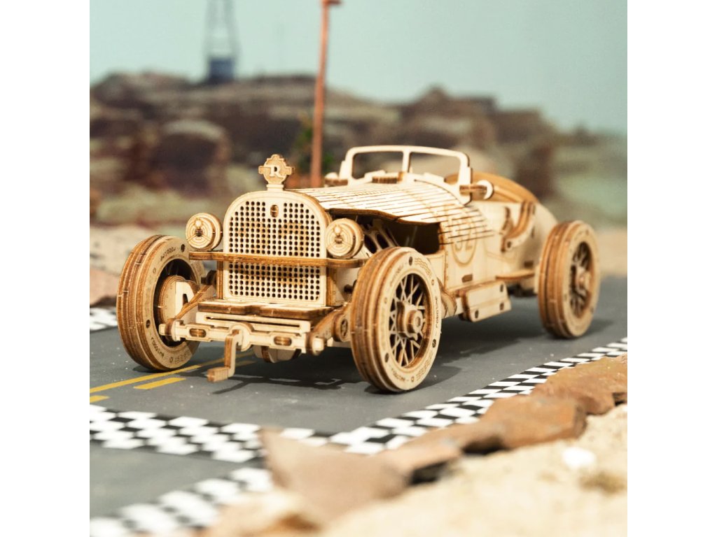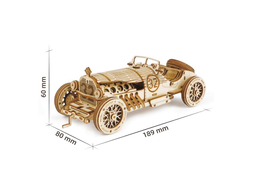 Detailní model historického závodního auta v měřítku 1:16 byl inspirován vozy, které stály u zrodu automobilového sportu. Je určen k vystavení a dekoraci, není proto pohyblivý. Přírodní úprava je univerzálně vhodná do každého interiéru, model však můžete přizpůsobit a nabarvit podle vlastních představ. Nezapomeňte se nám svou úpravou pochlubit! Skládačka je dodávána v krabici spolu s podrobným ilustrovaným návodem k sestavení. Hlavní vlastnosti:220 precizně vyřezaných dílkůstřední obtížnost sestaveníSizing info