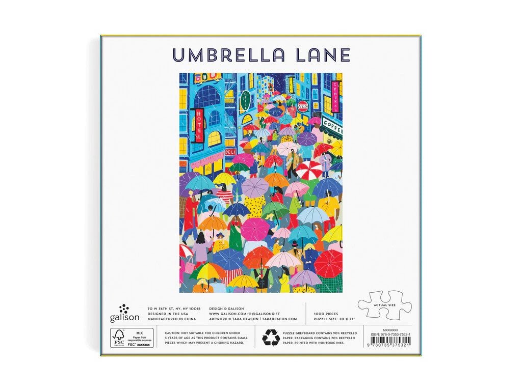 Puzzle deštníková ulička obsahuje odvážně ilustrovanou scénu deštivého města pro hodiny záhadné zábavy. Puzzle je baleno v pevné krabici, pro opětovné použití a skladování. Ideální jako dárek. Autorem obrázku je Tara Deacon. Puzzle jsou vyrobeny za použití významného podílu recyklovaného papíru a nabízí špičkový potisk nezávadnými barvami. Jsou opatřeny matnou povrchovou úpravou, která zajišťuje za všech okolností věrné podání detailů i barev. Jejich zadní strana je potažena hladkým, na dotek příjemným povrchem, díky němuž se při skladování rozloženého puzzle netvoří prach. Spolu s pečlivě zabalenými dílky naleznete v balení také letáček s návodným obrázkem, který zpravidla obsahuje další informace o tvůrcích a pozadí vzniku díla. Dodáváno v mimořádně pevné a poutavě zpracované kartonové krabičce vyrobené z recyklovaného kartonu a udržitelně získaných materiálů s certifikací FSC®. Hlavní vlastnosti: 1000 precizně vyřezaných dílkůvyrobeno s použitím recyklovaných a udržitelně získaných materiálůpečlivě vybraný motiv od renomovaných tvůrců a umělcůpotisk a provedení nejvyšší kvalityobsahuje návodný obrázekSizing info