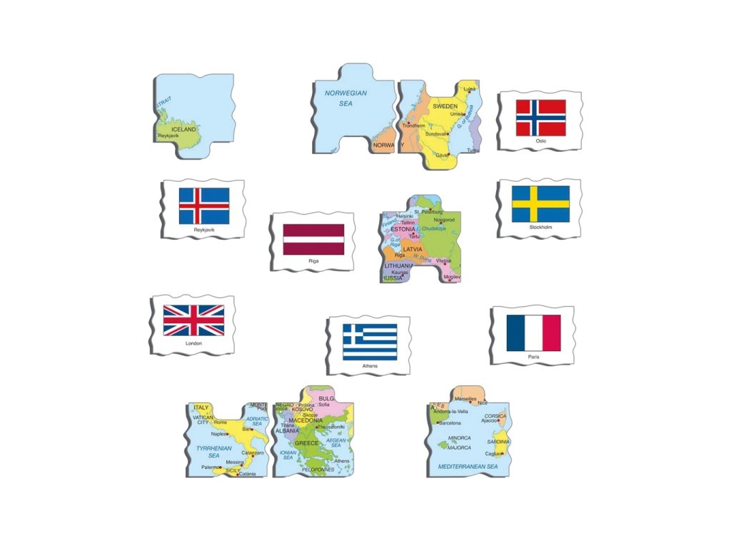 Švédsko, Řecko, Portugalsko. Najdete je na mapě? A víte, jakou mají vlajku a hlavní město? Všechny důležité informace zjistíte díky vzdělávacímu puzzle s mapou Evropy. Při skládání se děti zábavnou formou učí umístění evropských států, hlavní města a další významná města a vlajky. Puzzle je navrženo tak, aby bylo zábavné, ale také vzdělávací. Podporuje vizuální paměť a rozšiřuje geografické znalosti. Je to ideální doplněk výuky doma i ve škole. Kvalitní a pevné dílky zajistí pohodlné skládání a dlouhou životnost. Hlavní vlastnosti: 70 dílkůvzdělávací a zábavnépodporuje logické myšlení a vizuální paměť vhodné pro děti od 4 letSizing info