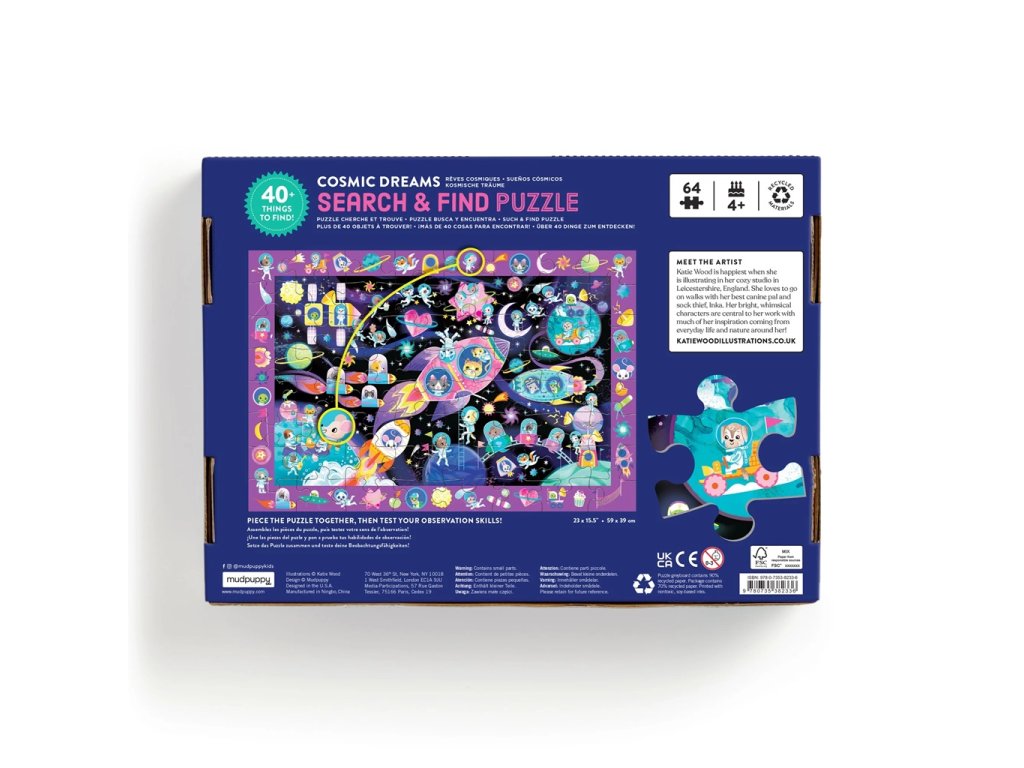 Fascinující vesmír! Planety, hvězdy, komety, rakety a roztomilá zvířátka jako astronauti. Bude to výzva! Skládání puzzle je jen polovina zábavy! Po dokončení puzzle si děti mohou otestovat své pozorovací schopnosti a postřeh a najít více než 40 předmětů a zvířat, které jsou zobrazeny po stranách, ve složeném obrázku. Puzzle je vytvořeno podle námětu Katie Wood, která se ráda inspiruje každodenním životem a přírodou. Provedení puzzle v pestrých barvách děti zaujme a motivuje je k hraní bez obrazovek. Skládání rozvíjí dovednosti v řešení problémů, prostorové uvažování a koordinaci ruka-oko, a to vše zábavnou formou. Puzzle je vyrobeno zodpovědně za použití vysokého podílu recyklovaného materiálu (90 % puzzle a 70 % obal) s certifikací FSC® a je potištěno pestrými netoxickými barvami. Spolu s pečlivě zabalenými odolnými dílky naleznete v pevné kartonové krabičce také letáček s návodným obrázkem. Hlavní vlastnosti 64 dílkůpodle námětu Katie Woodrozvíjí prostorové uvažování a koordinaci ruka-okoodvede pozornost dětí od obrazovekvyrobeno s použitím recyklovaných a udržitelně získaných materiálů s certifikací FSC®potištěno netoxickými barvamivhodné od 4 let Značka a certifikát FSC® (Forest Stewardship Council) zaručuje, že dřevo, ze kterého byl produkt vyroben, nebylo vytěženo nelegálně a pochází z lesů obhospodařovaných šetrným či přírodě blízkým způsobem, ve kterém jsou dodržovány přísné environmentální a sociální požadavky. Značka FSC® na výrobku znamená, že svým nákupem pomáháte chránit lesy a podporujete šetrné, odpovědné či přírodě blízké hospodaření, díky kterému jsou naše lesy stabilnější, zdravější, mají přirozenou druhovou skladbu a lépe odolávají negativním následkům klimatických změn.Sizing info
