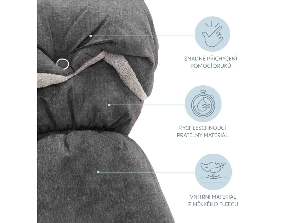 Univerzální hřejivé rukavice, které zabrání prochladnutí rukou v chladném období. Jednoduchá instalace pomocí druků. Vhodné jak pro kočárky se spojenou rukojetí, tak pro golfové kočárky. Větru a vodě odolný materiál.
