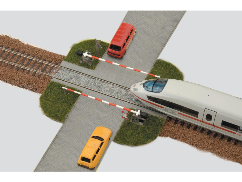 Závory železničního přejezdu. Zachovejte bezpečnost provozu i při hře! Rozměr cca 14x15 cm. Kolej není součástí balení.Sizing info