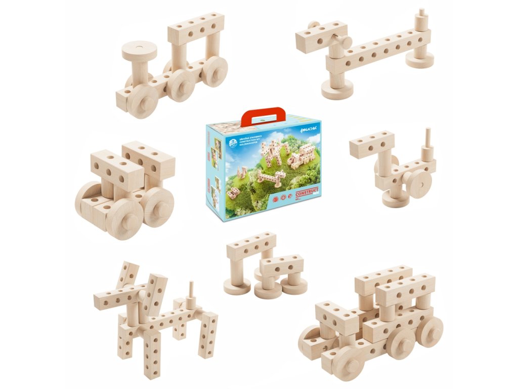 Složte si ze 44 dílků zvířátka, vláčky či auta podle vašich představ. Nebo využijte některý z návodů na krabici a zabavte sebe i své děti na dlouhé hodiny dřevěnou kreativní zábavou! Stavebnice CONSTRUCT obsahuje skládací a rozkládací modely autíček, zvířat a dalších modelů, zhotovené z bukových hranolů a válečků o rozměrech 32x32 mm v délkách od 32 do 256 mm. Dílky mají otvory a jsou vzájemně kompatibilní a umožňují postavit desítky variant modelů. Je uložena v pevné kartónové krabici, která zajišťuje její dlouholetou životnost. Hlavní vlastnosti: obsahuje 44 dílůprecizní a pečlivé zpracováníz odolného masivního bukového dřevakompatibilní s dalšími stavebnicemi řady Constructvyrobeno v České republiceSizing info