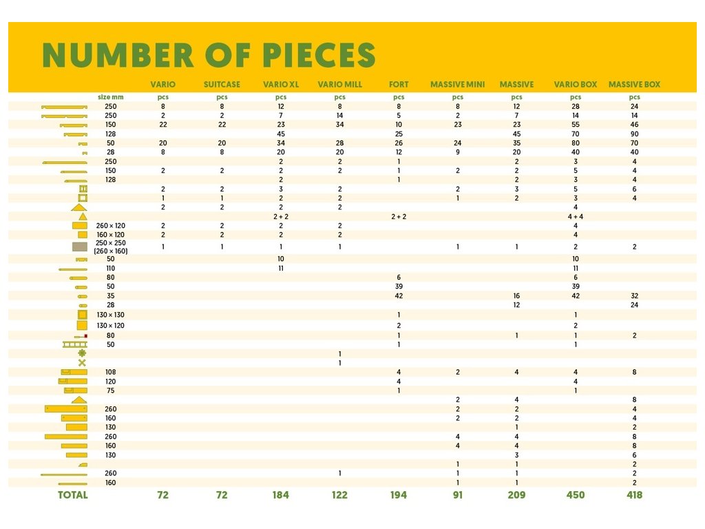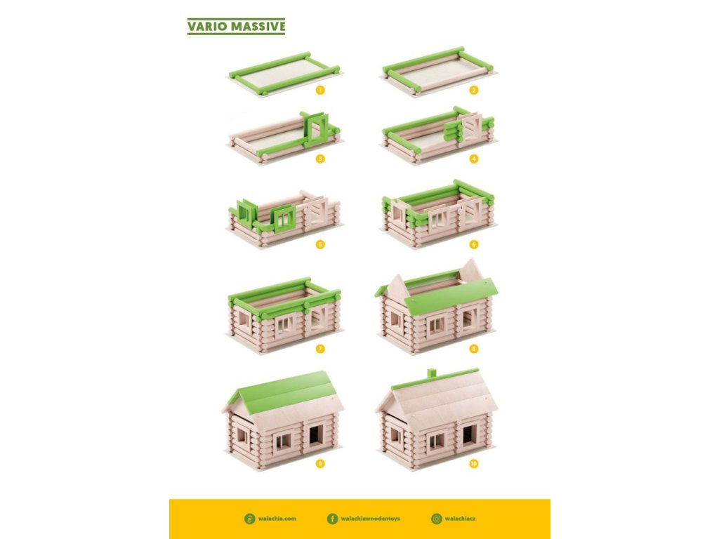 Variabilní stavebnice české výroby umožňuje sestavovat a znovu rozebírat nejméně 12 různých typů budov. Skládá se zejména z robustních kulatých, pečlivě opracovaných bukových dřívek s půlkulatými zámky, manipulace s nimi je výjimečně snadná a bezpečná. Obsahuje však také řadu precizně zpracovaných dílů dveří a oken, kompletní soupis jednotlivých součástí naleznete níže. Stavebnice řady Vario jsou mezi sebou kompatibilní, lze je kombinovat a vytvářet stále nové, rozmanité stavby, mohou tak růst spolu se schopnostmi a dovednostmi dětí. Přírodní povrchová úprava dílů umožňuje individuální úpravy jejich vzhledu, lze je lakovat a barvit dle fantazie. Díky svým jedinečným vlastnostem a zpracování může stavebnice nabídnout vysokou životnost a představovat zábavu předávanou po generace. Dodáváno v pevné a odolné kartónové krabici. Hlavní vlastnosti: 91 dílů celkemprecizní a pečlivé zpracováníz odolného masivního bukového dřevakompatibilní s dalšími stavebnicemi řady Variovyrobeno v České republiceSizing info