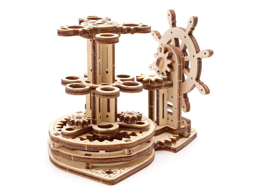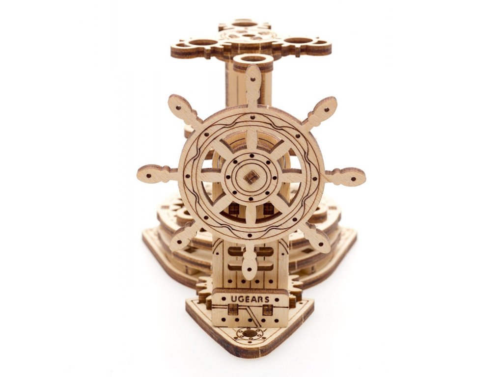 Jaký bude Váš příští kurz? Stavebnice organizéru psacích potřeb vyrobená z překližky. Ať už velíte druhým, nebo jste vlastními pány, s organizérem budete moci práci bezpečně kontrolovat. Pomocí velkého kormidla můžete otáčet kolečkem s nabídkou svých tužek, pastelek, propisek, či štětců. Přitom můžete podrobně sledovat práci planetového soukolí, pomyslného srdce mechanismu. Stavba modelu je nenáročná, a je proto vhodná k relaxaci, nebo i pro menší děti, které u ní mohou pod dohledem dospělých prověřit své dovednosti. Zážitek ze sestavování modelu pak můžete umocnit a prodloužit tím, že se jej pokusíte zkompletovat bez použití návodu. Organizér je samozřejmě také možno individuálně vybarvit pomocí akvarelových barev. Vybaveno detailním návodem k sestavení. Hlavní vlastnosti:51 precizně vyřezaných dílkůnízká obtížnost sestavení6 pozic k uložení psacích potřebnavrženo a vyrobeno na UkrajiněSizing info