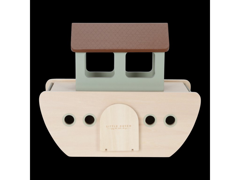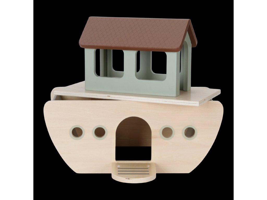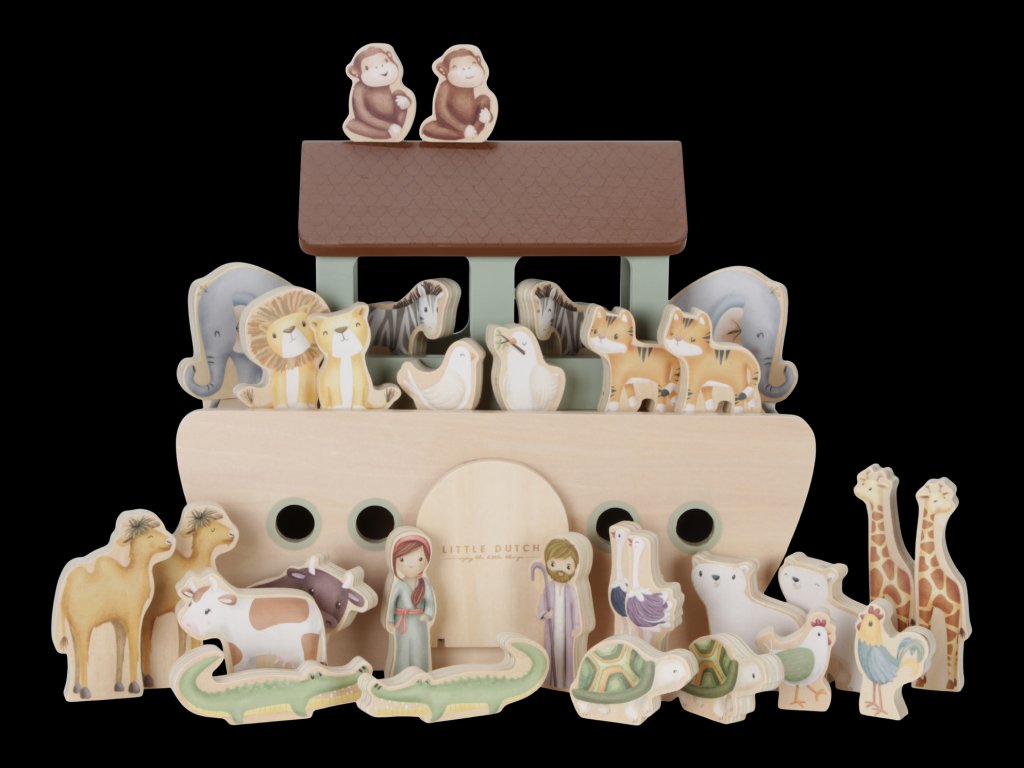 Všichni na palubu! Zahrajte si příběh Noemovy archy s touto krásnou dřevěnou sadou. Najděte páry zvířat, která k sobě patří a připravte je na cestu. 25-dílná dřevěná sada obsahuje archu s dveřmi, palubu, kterou lze zvednout a přivést všechna zvířata na palubu. Noe vezme svoji ženu a velkou skupinu zvířat na cestu přes oceán: 2 lvy, 2 slony, 2 zebry, 2 opice, 2 holuby, 2 krokodýly, 2 želvy, 2 žirafy, 2 pštrosy, 2 krávy, slepici a kohouta. Hračka pomáhá rozvíjet představivost a slovní zásobu, zatímco vaše dítě poznává tento klasický příběh. Rozměry: 29,7 x 24,7 x 14,6 cm Vhodné pro děti od 18 měsíců.Doplňkové parametry