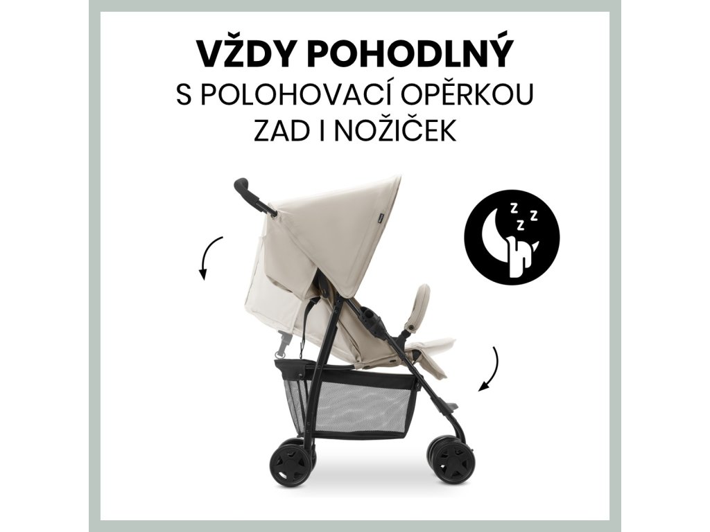 POHODLNÝ V KAŽDÉ SITUACI // Díky polohovací opěrce zad i nožiček se bude vaše maličké cítit pohodlně ať v sedě či v leže. Opěrku lze snadno polohovat jednou rukou. Prostorná stříška chrání vaše děťátko před sluncem a větrem.
