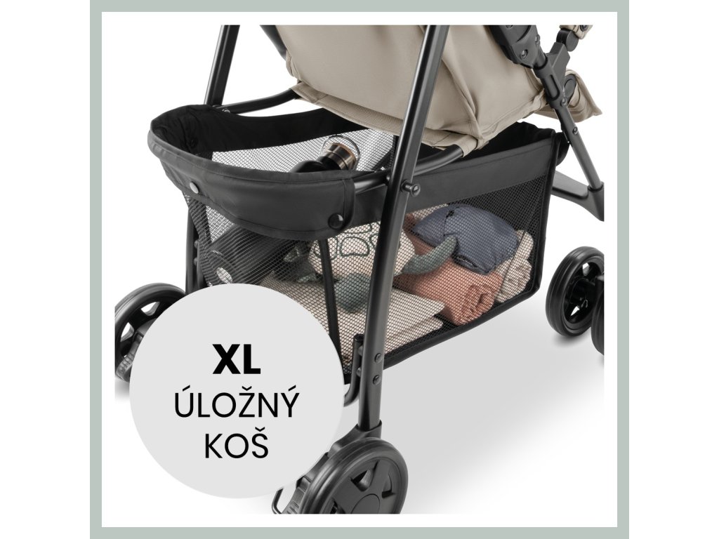 DOSTATEK ÚLOŽNÉHO PROSTORU DÍKY XL KOŠI // Hračky, tašku na plenky, svačinku, vše, co potřebujete na procházku jednoduše uložíte do prostorného XL koše, stejně tak i nákup. Prostorný úložný koš snadno pojme vše potřebné.